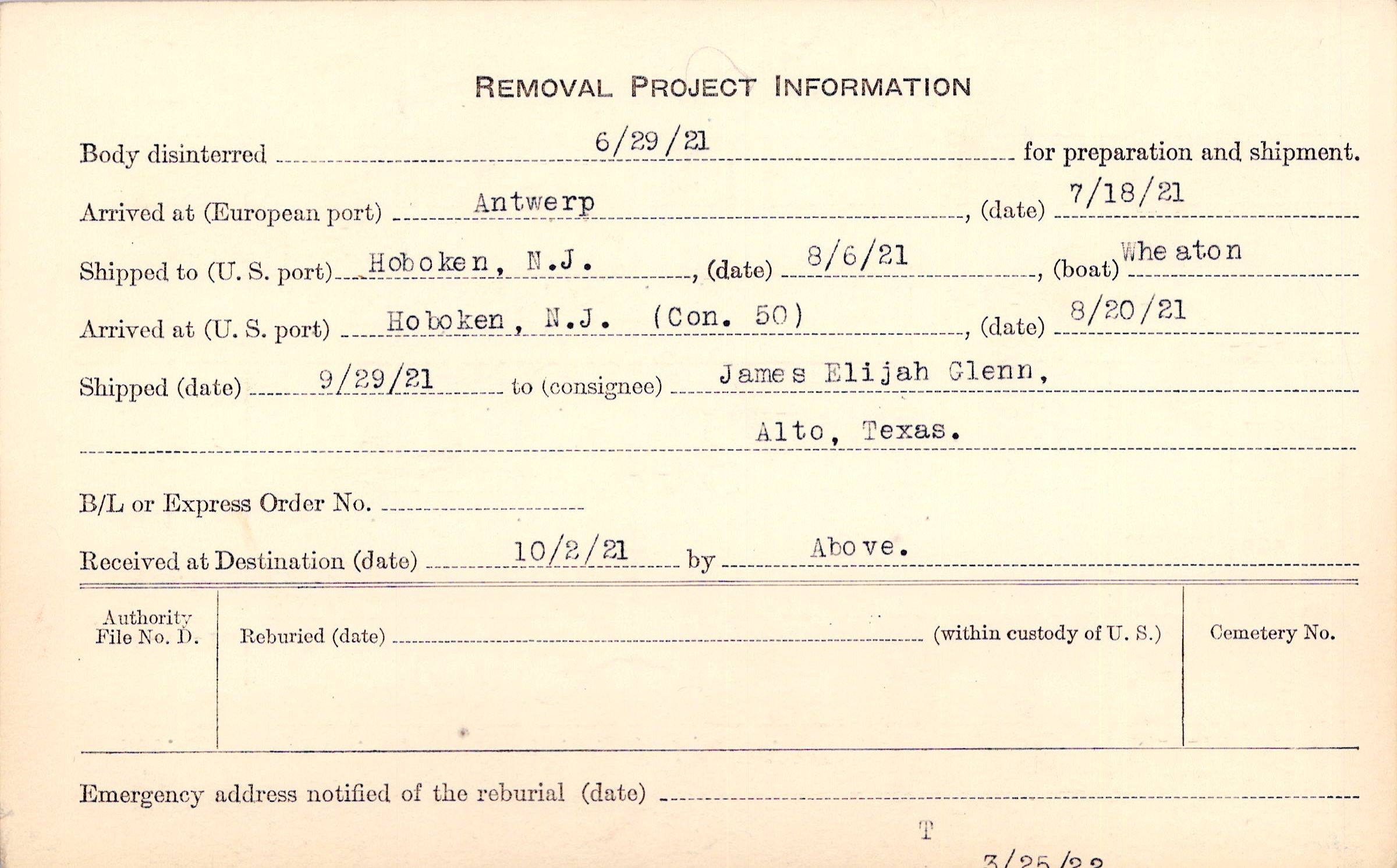 Mr. James E. Glenn, (Father), RFD #1; Rusk, Texas.