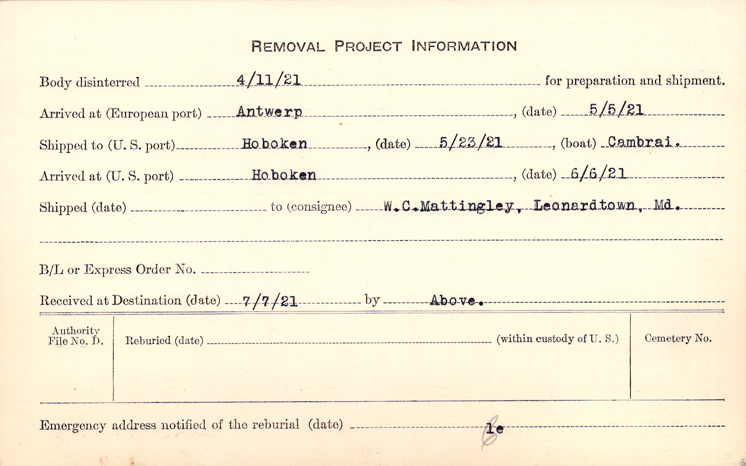 Body disinterred 4/11/1921 for preparation and shipment.