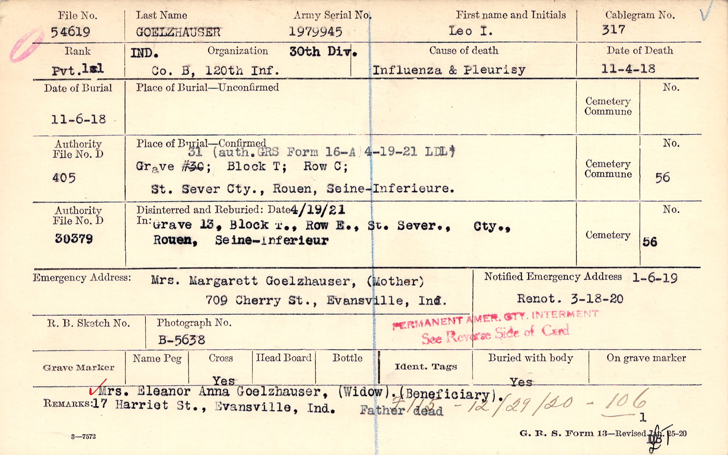 Mrs. Margarett Goelzhauswer, (Mother), 709 Cherry St., Evansville, Ind., Mrs. Eleanor Anna Goelzhauser, (Widow). (Beneficiary). 17 Harriet St., Evansville, Ind Father dead