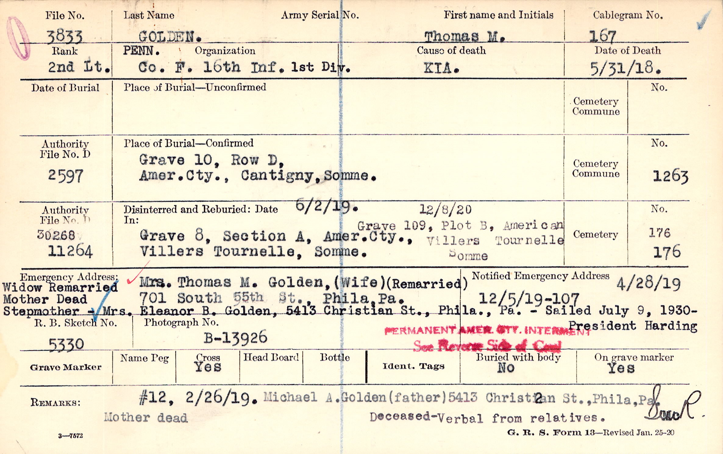 Mrs. Thomas M. Golden, (Wife), 701 South 55th St., Phila, Pa., (Remarried) Widow Remarried Mother Dead Stepmother - Mrs. Eleanor B. Golden, 5413 Christian St., Phila., Pa. - Sailed July 9, 1930 - President Harding