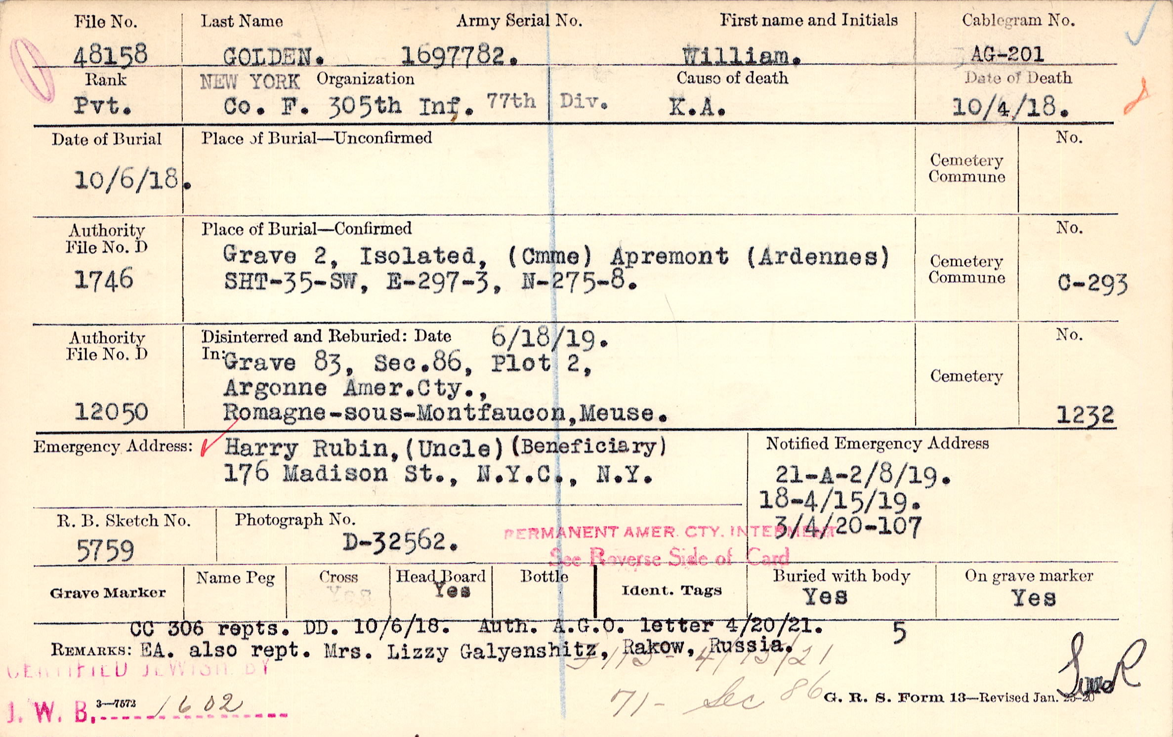 CC 306 repts. DD. 10/6/18. Auth. A.G.O. letter 4/20/21. EA. also rept. Mrs. Lizzy Galyenshitz, Rakow, Russia, F115 - 4/15/21 71 - Sec 86