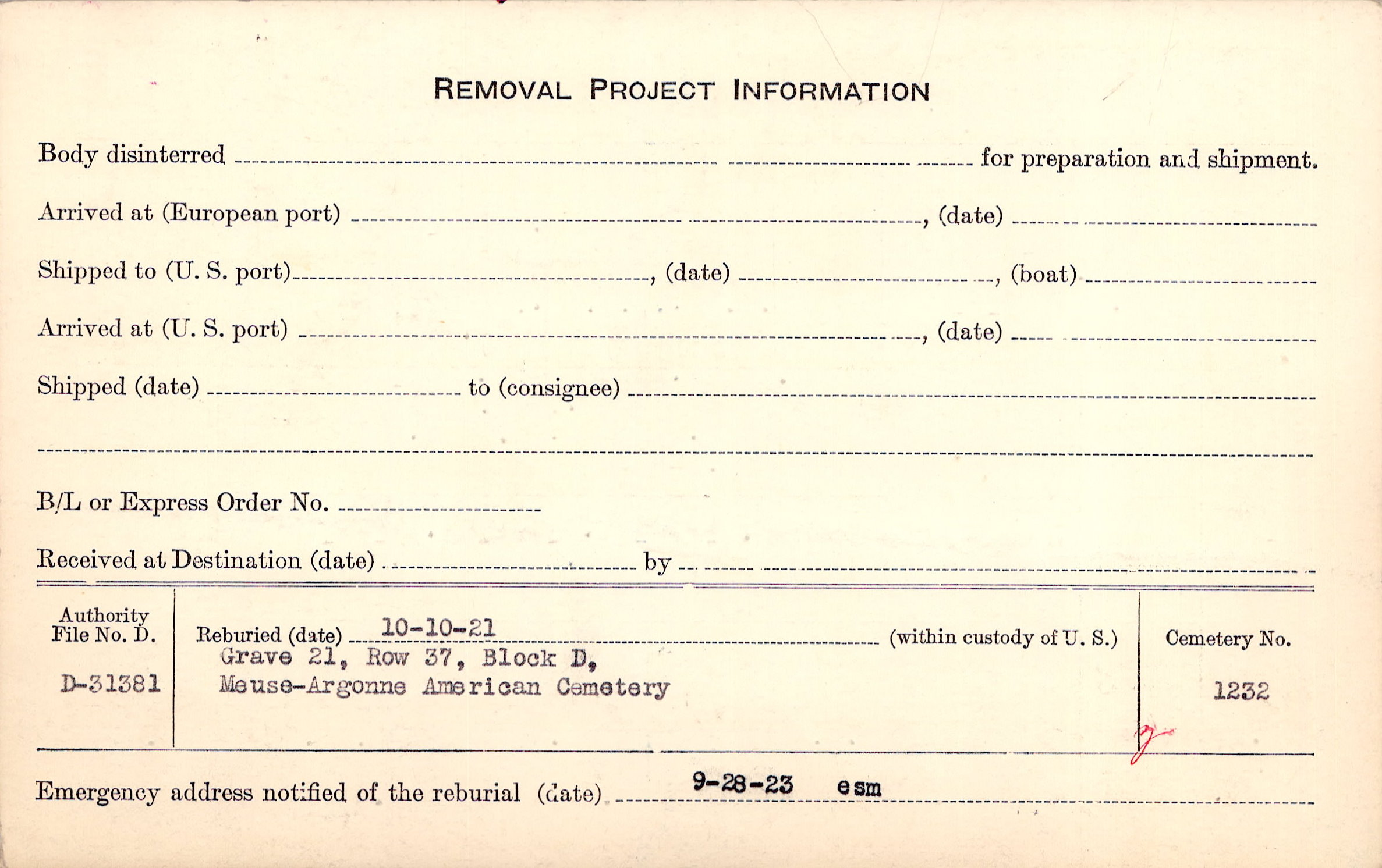 | Permanent Burial in Foreign Cemetery |