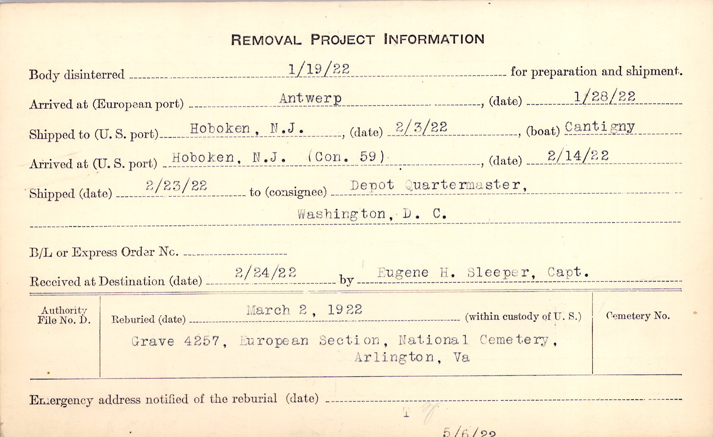Body disinterred 1/19/1922 for preparation and shipment.