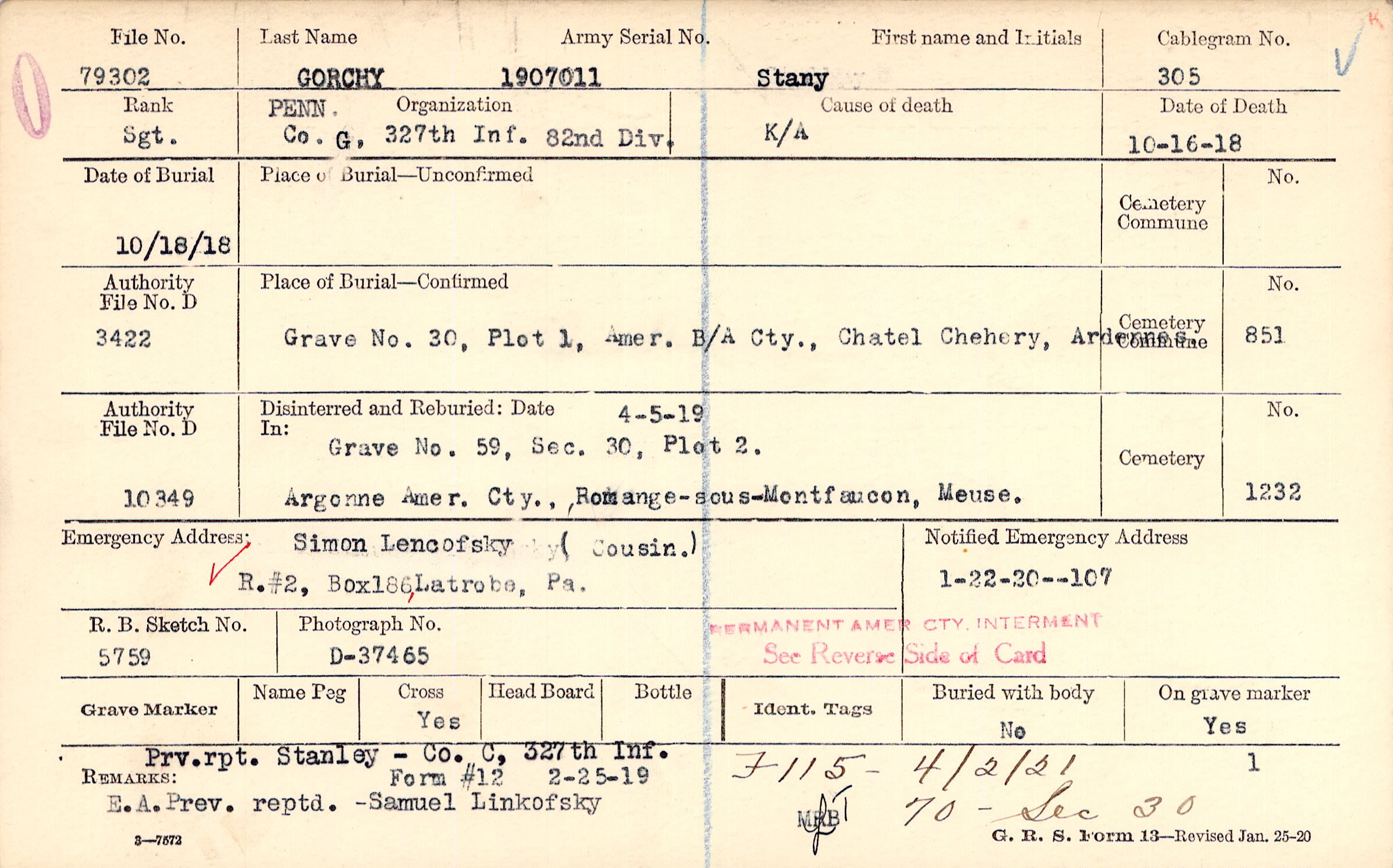 Prv. rpt. Stanley - Co. C, 327th Inf. E.A. Prev. Reptd. Samuel Linkofsky, Form #12 2-25-19, F115 - 4/2/21 70 -Sec 30