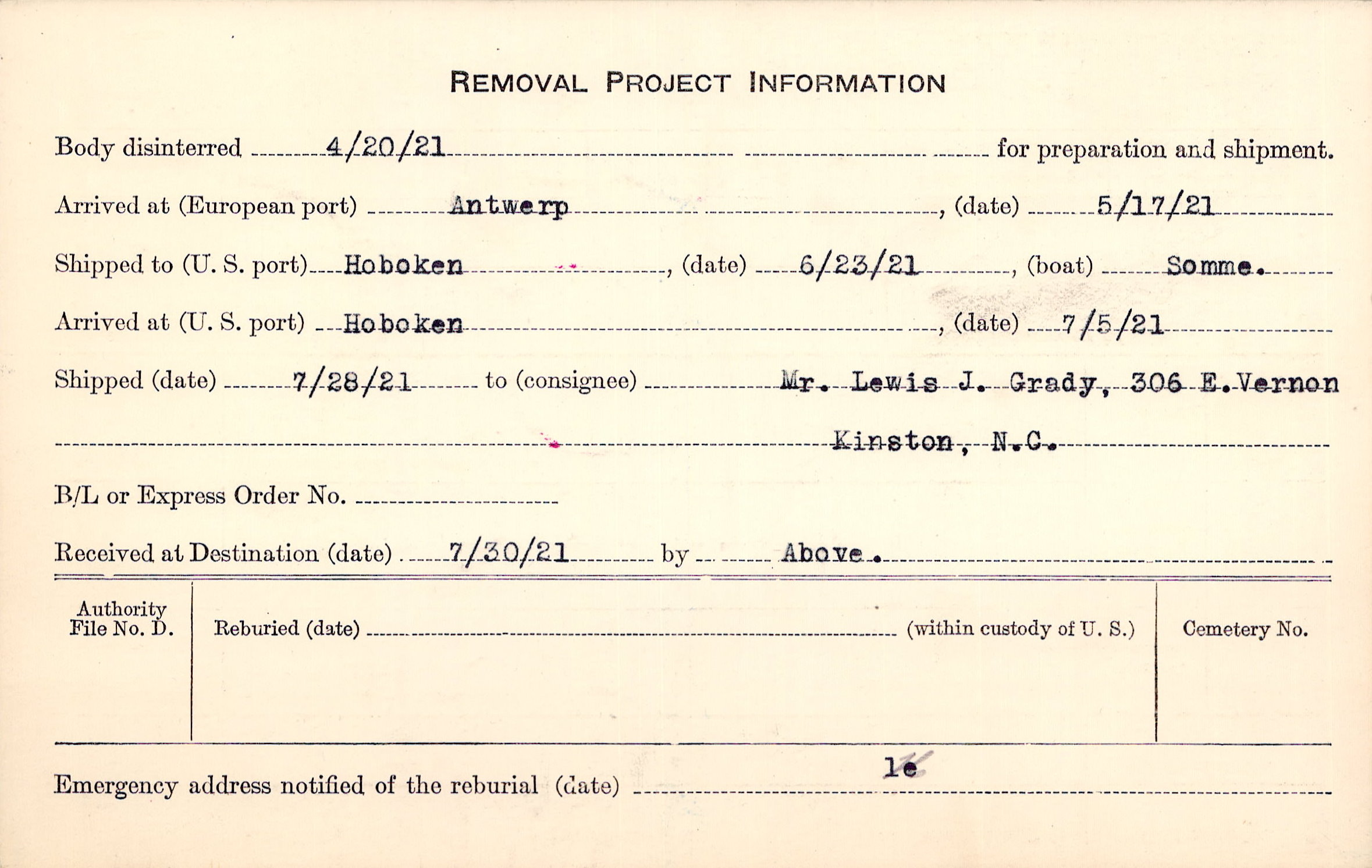 Body disinterred 4/20/1921 for preparation and shipment.