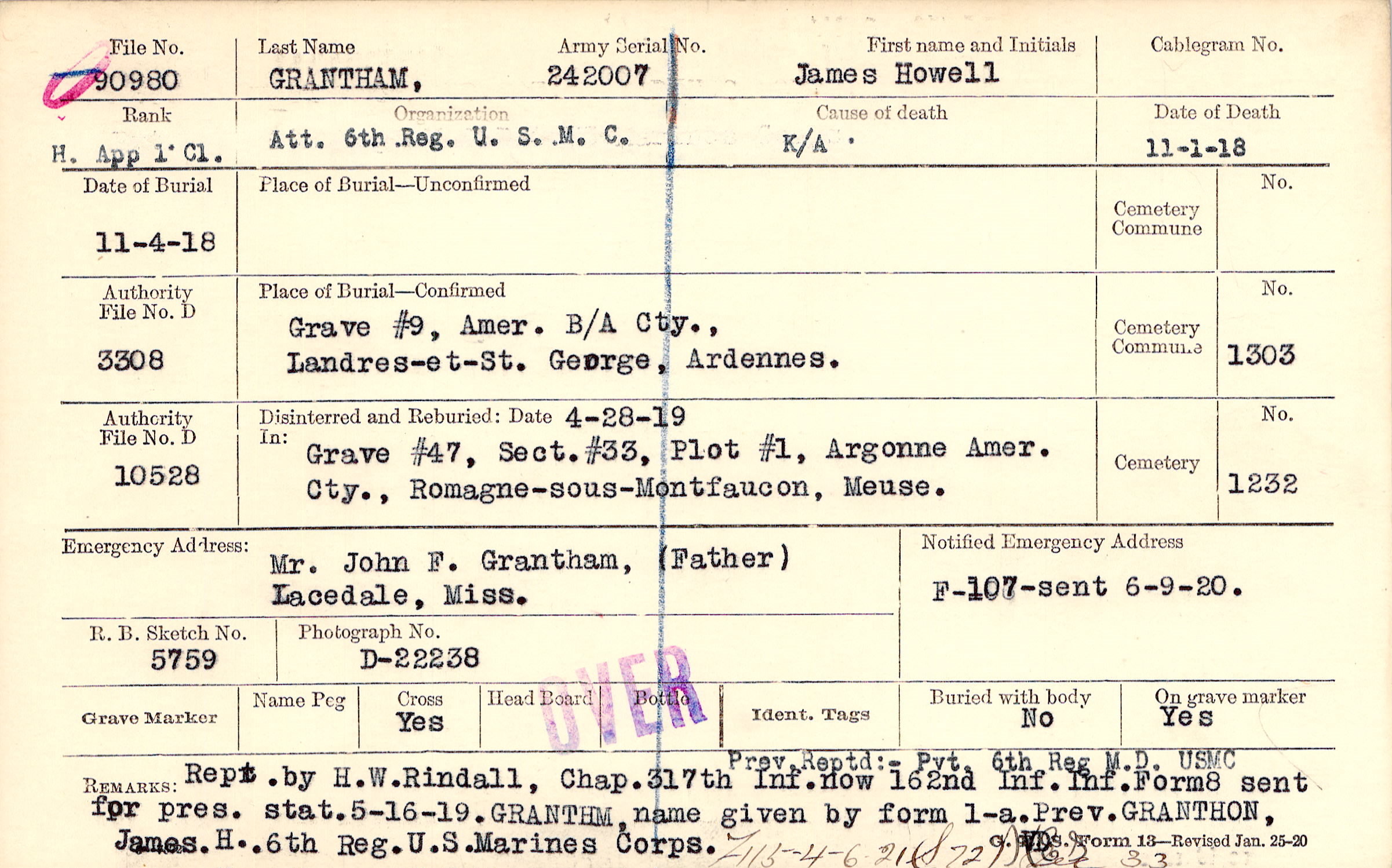 Grave 47, Section 33, Plot 1, Argonne American Cemetery, Romagne-sous-Montfaucon, Meuse