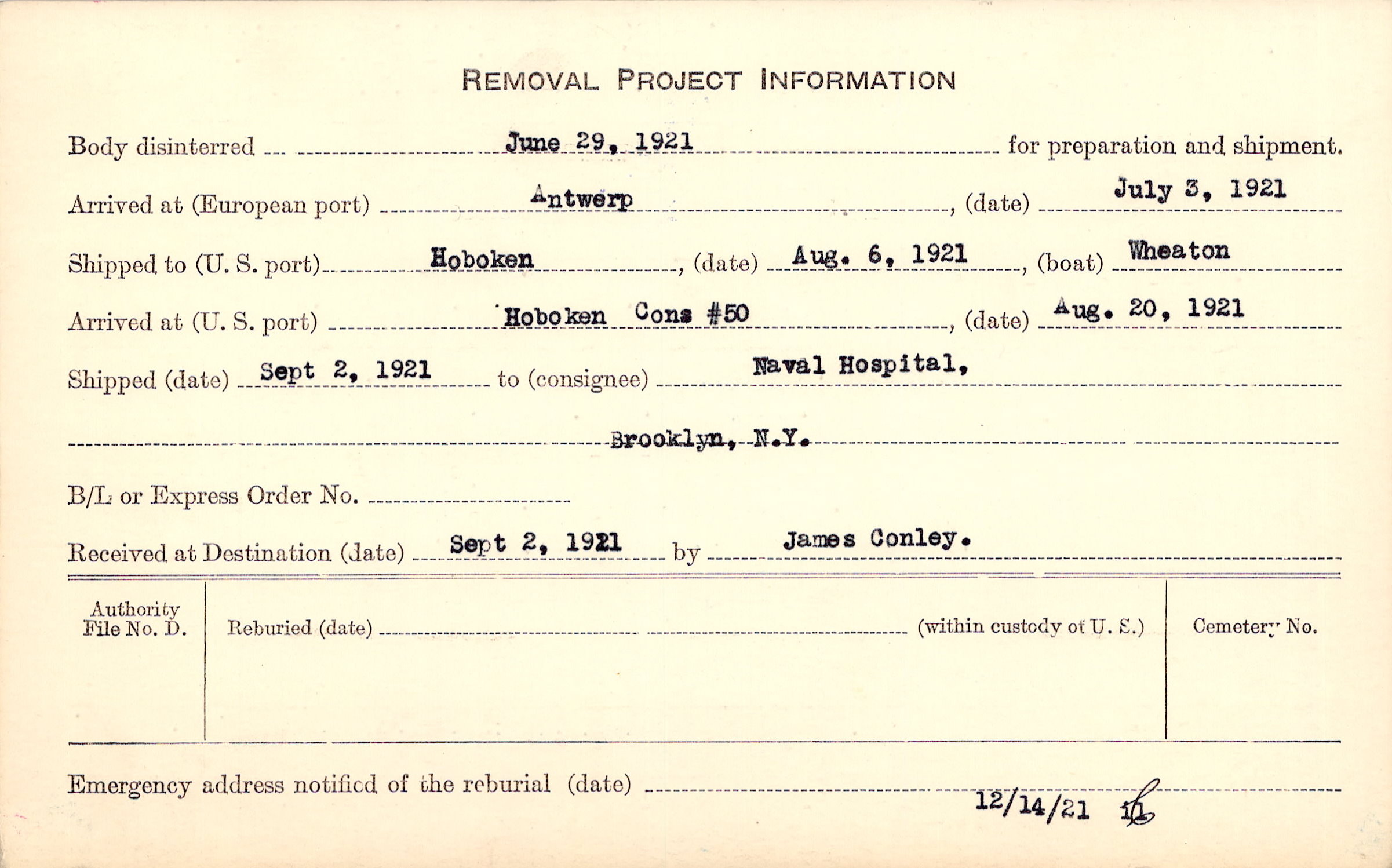 Body disinterred 6/29/1921 for preparation and shipment.