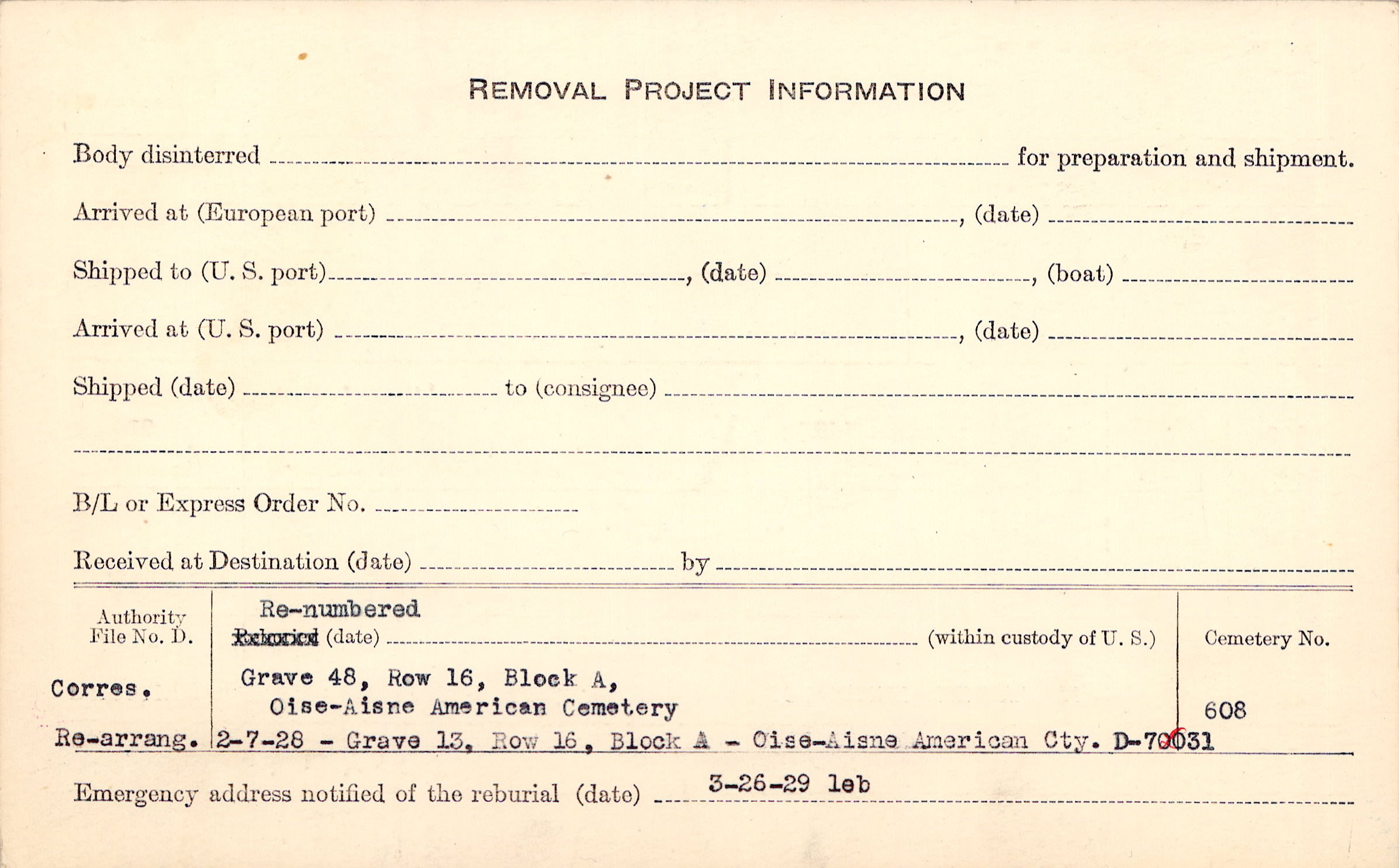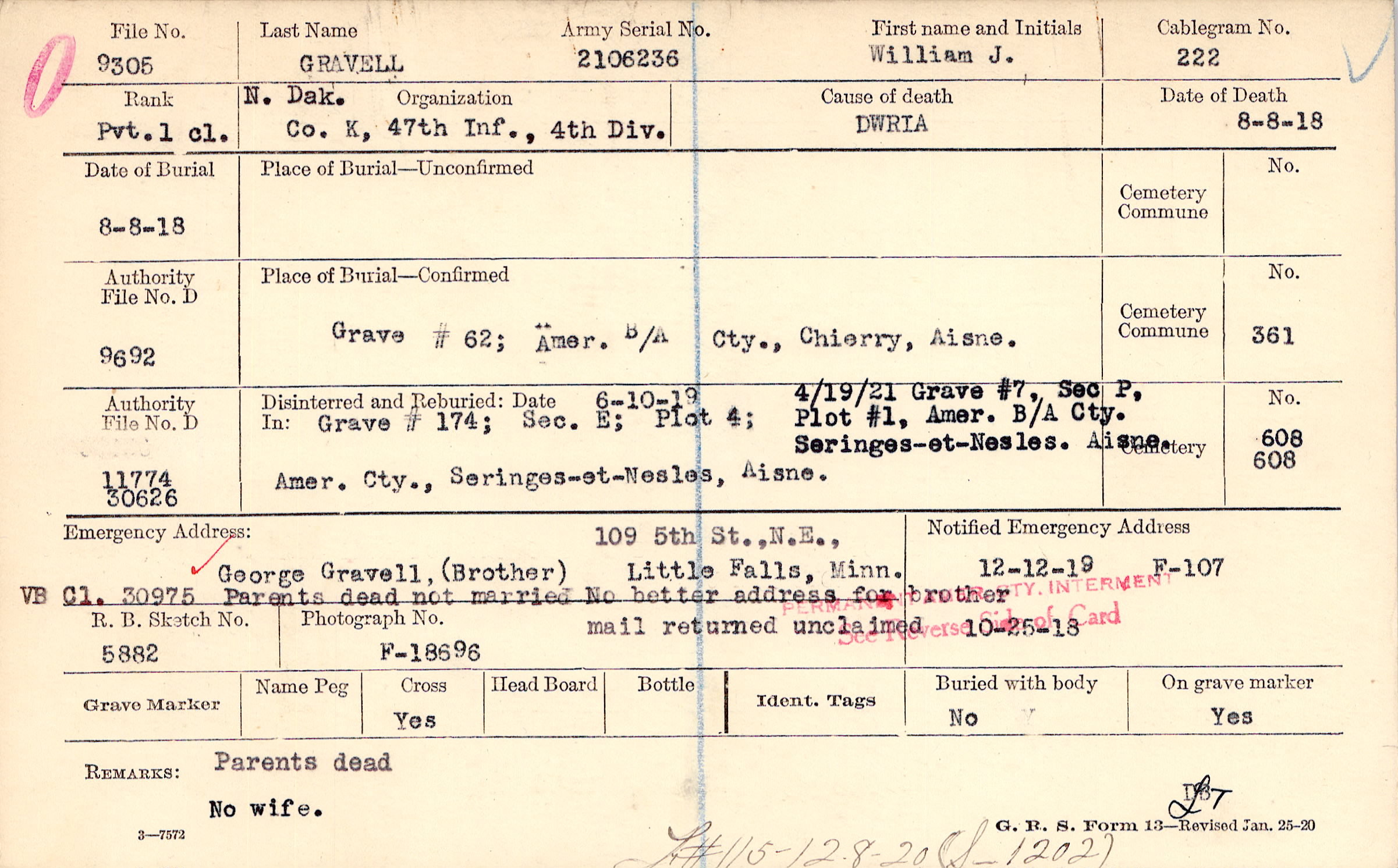 George Gravell, (Brother), 109 5th St., N.e., Little Falls, Minn., 109 5th St.,N.E. VB Cl. 30975 Parents dead not married No better address for brother mail returned unclaimed