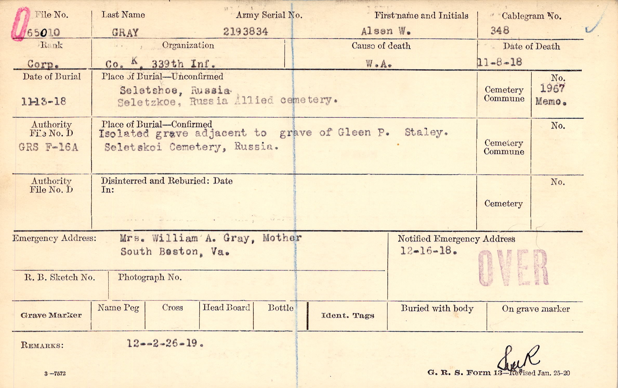 Isolated grave adjacent to grave of Gleen P. Staley., Seletskoi Cemetery, Russia.