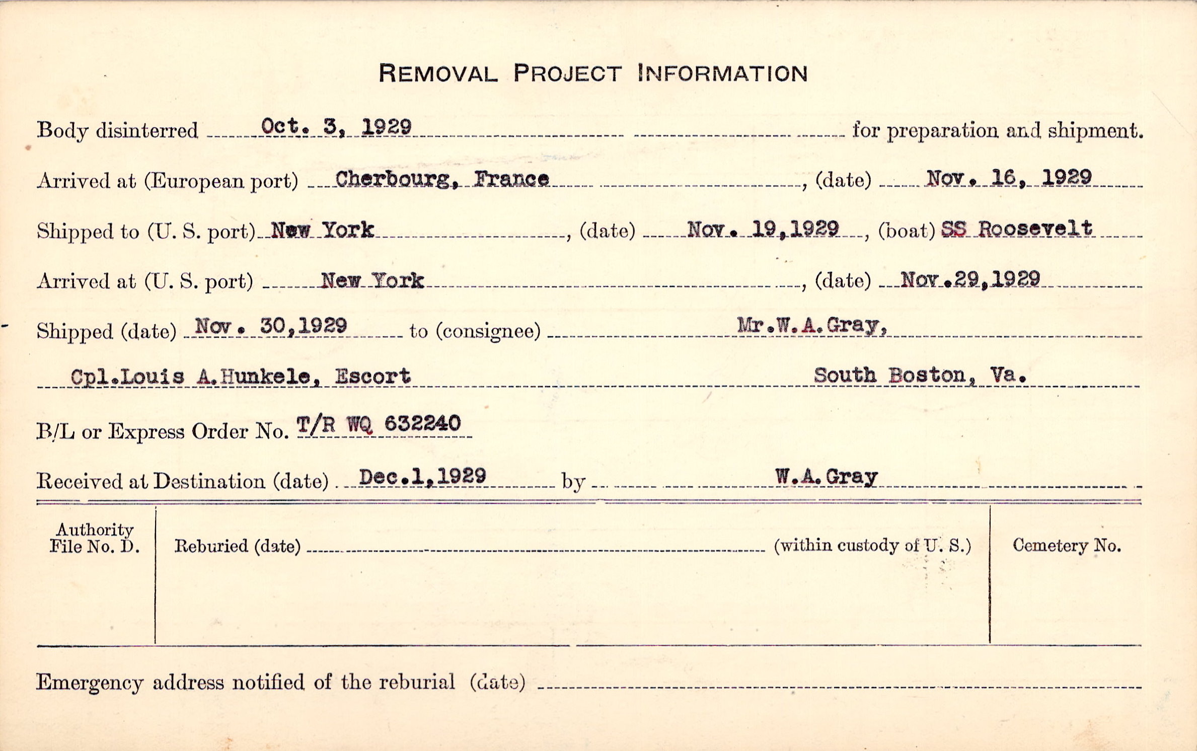 to Mr. W. A. Gray, Cpl. Louis A. Hunkele, Escort South Boston, Va.