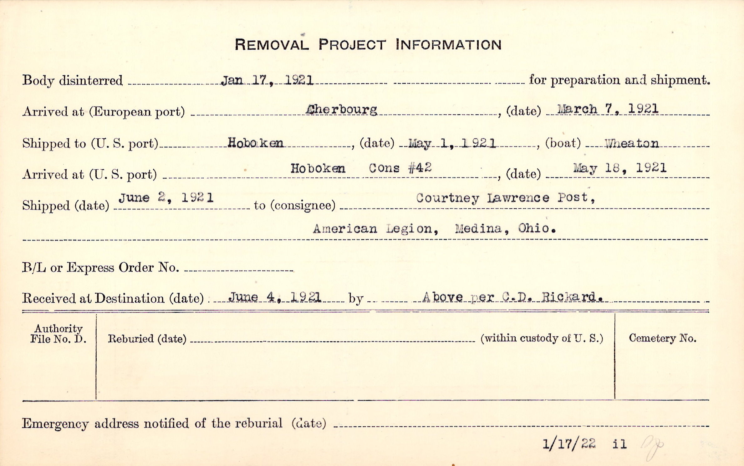 Body disinterred 1/17/1921 for preparation and shipment.