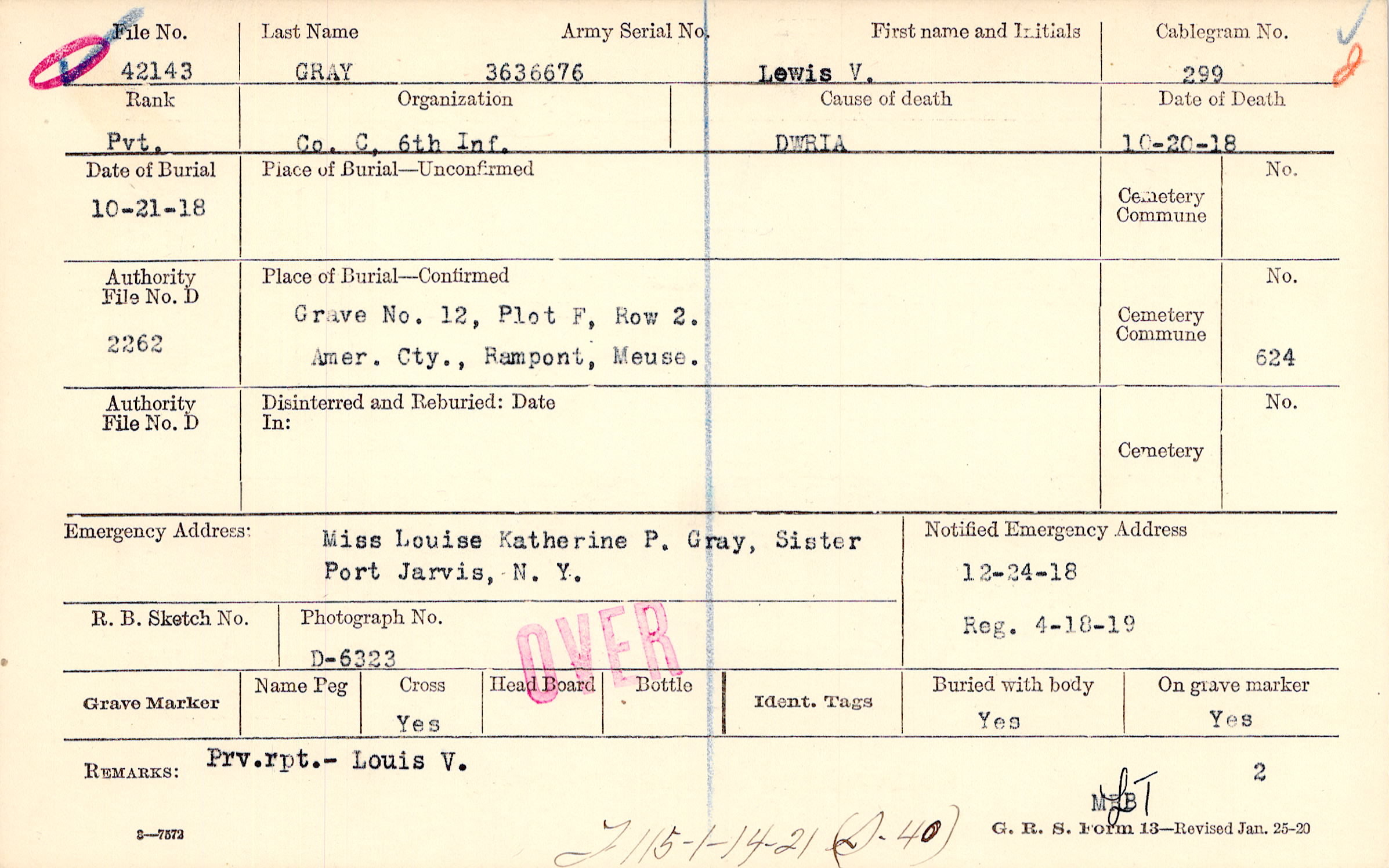 Grave 12, Plot F, Row 2., Amer. Cty., Rampont, Meuse.