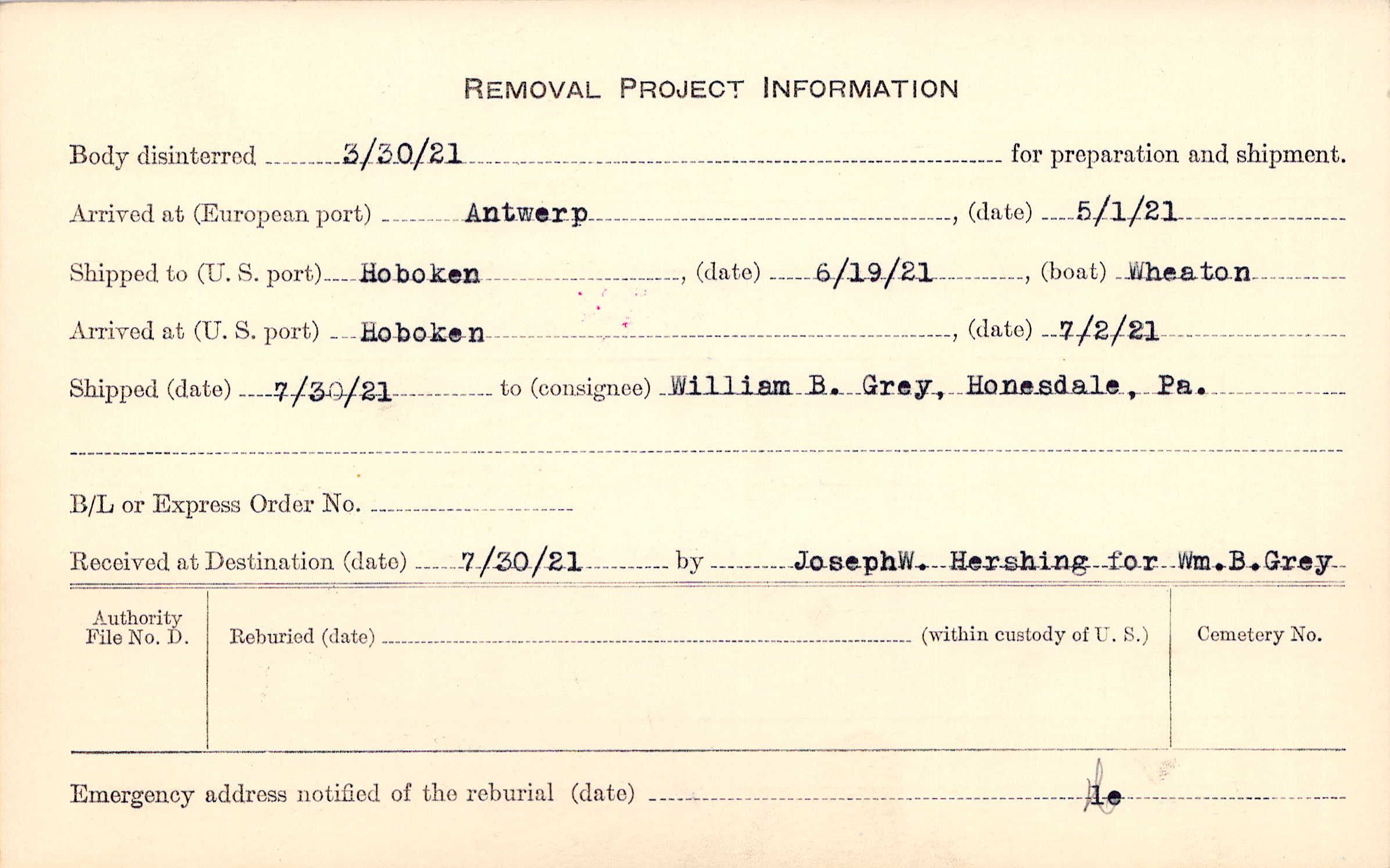 Body disinterred 3/30/1921 for preparation and shipment.