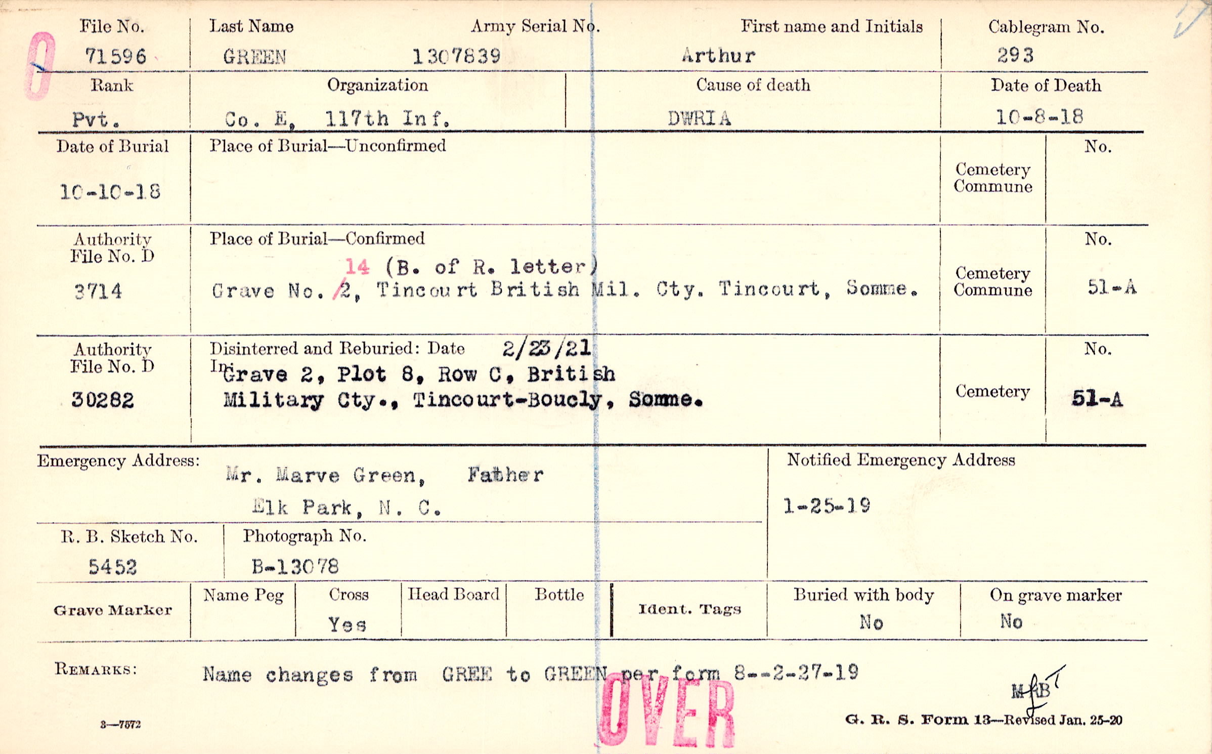 Grave 14, B. of R. letter), Tincourt British Mil. Cty., Tincourt, Somme.