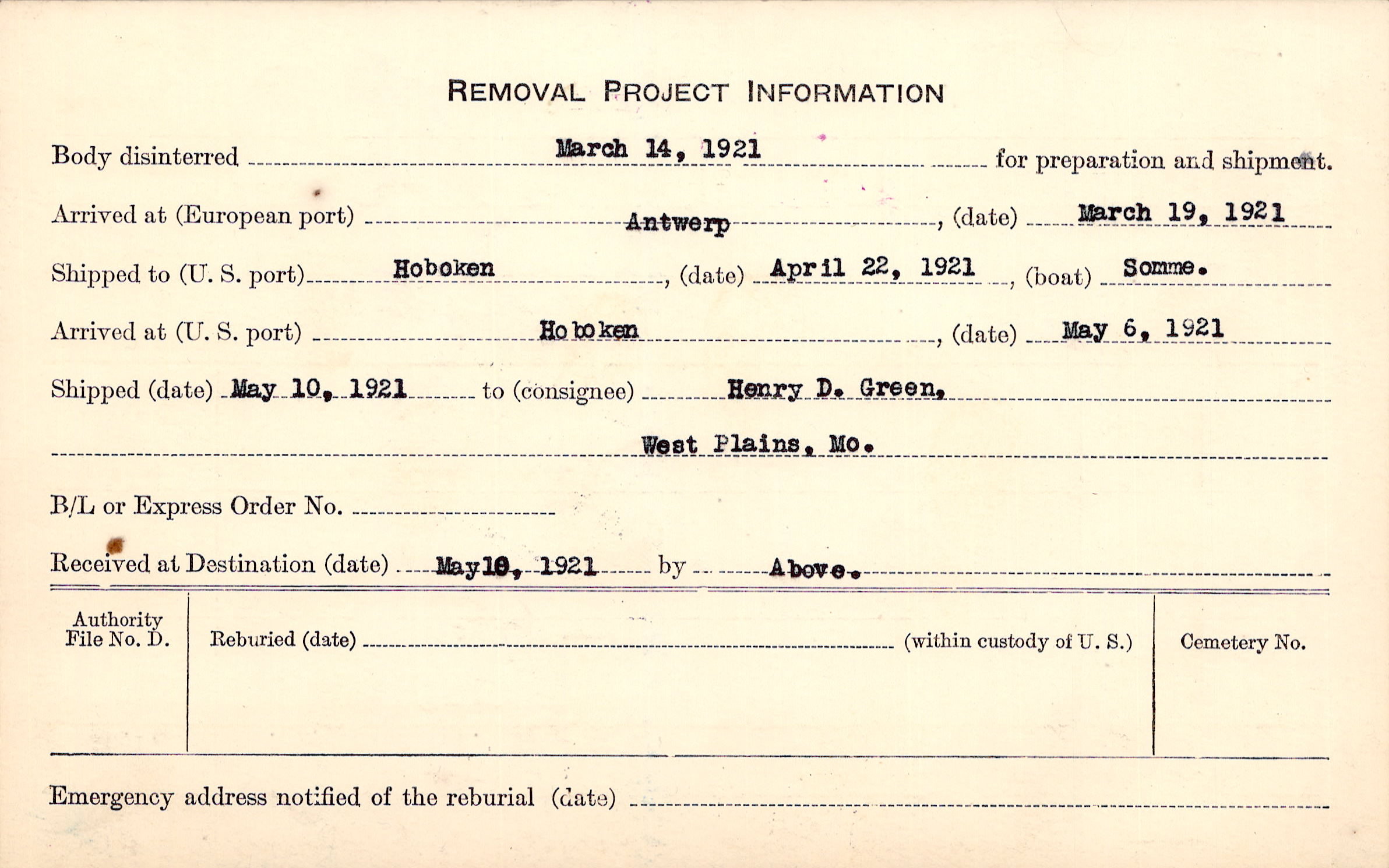 Body disinterred 3/14/1921 for preparation and shipment.