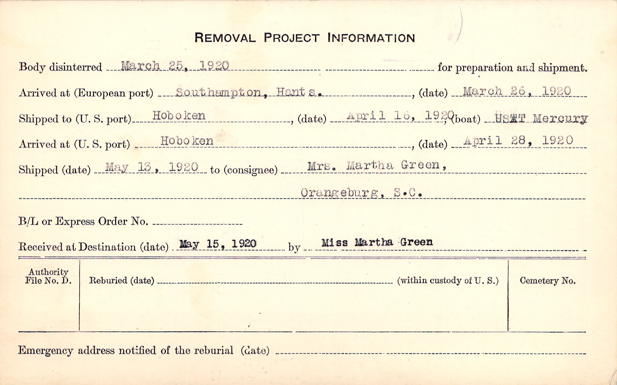 Body disinterred 3/25/1920 for preparation and shipment.