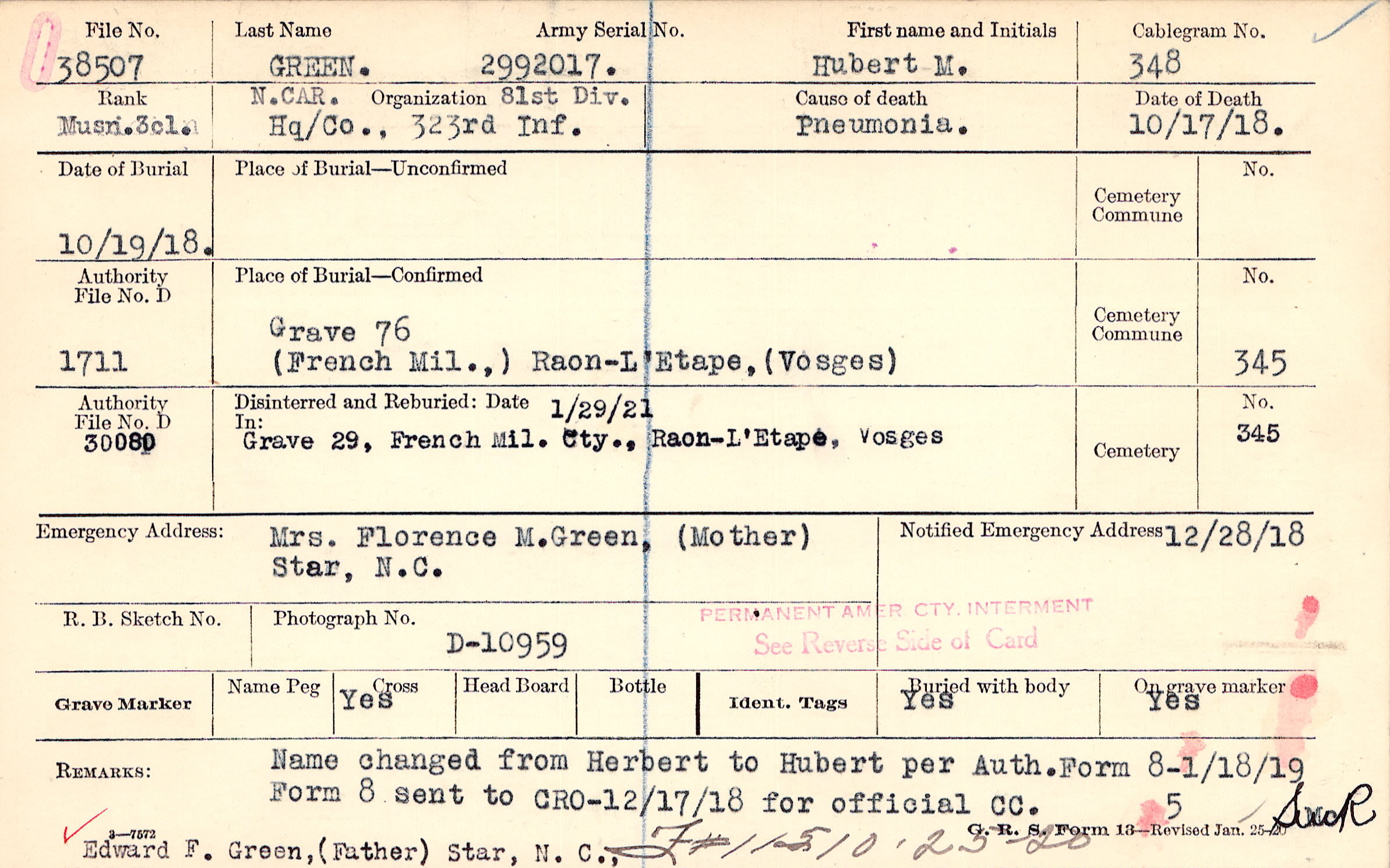 Name changed from Herbert to Hubert per Auth. Form 8-1/18/19 Edward F. Green, (Father) Star, N. C.,, Form 8 sent to CRO-12/17/18 for official CC. Name changed from Herbert to Hubert per Auth. Form 8-1/18/19, F#115-10-25-20