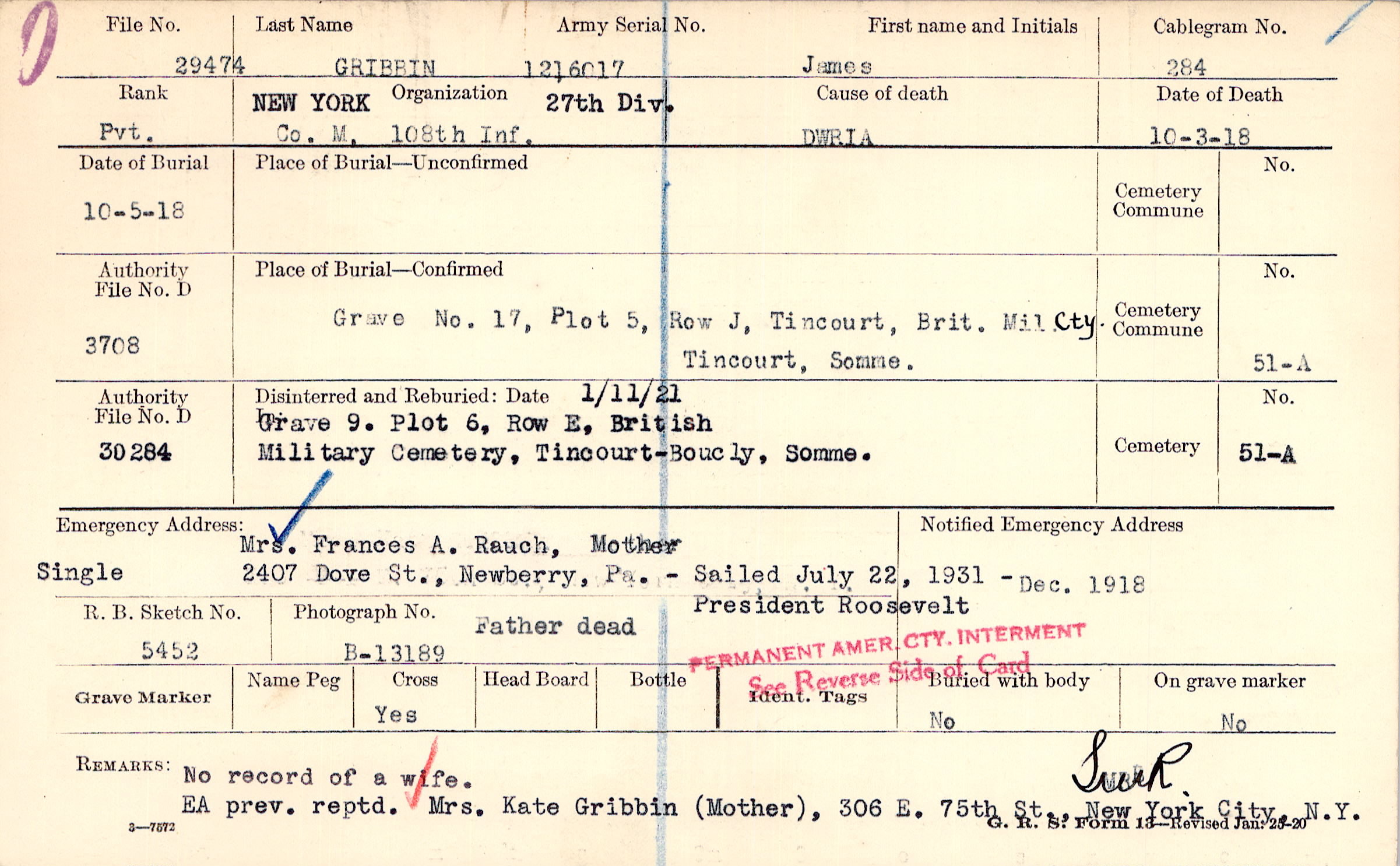 No record of a wife. EA prev. reptd. Mrs. Kats Gribbin (Mother), 306 E. 75th St., New York City, N.Y.