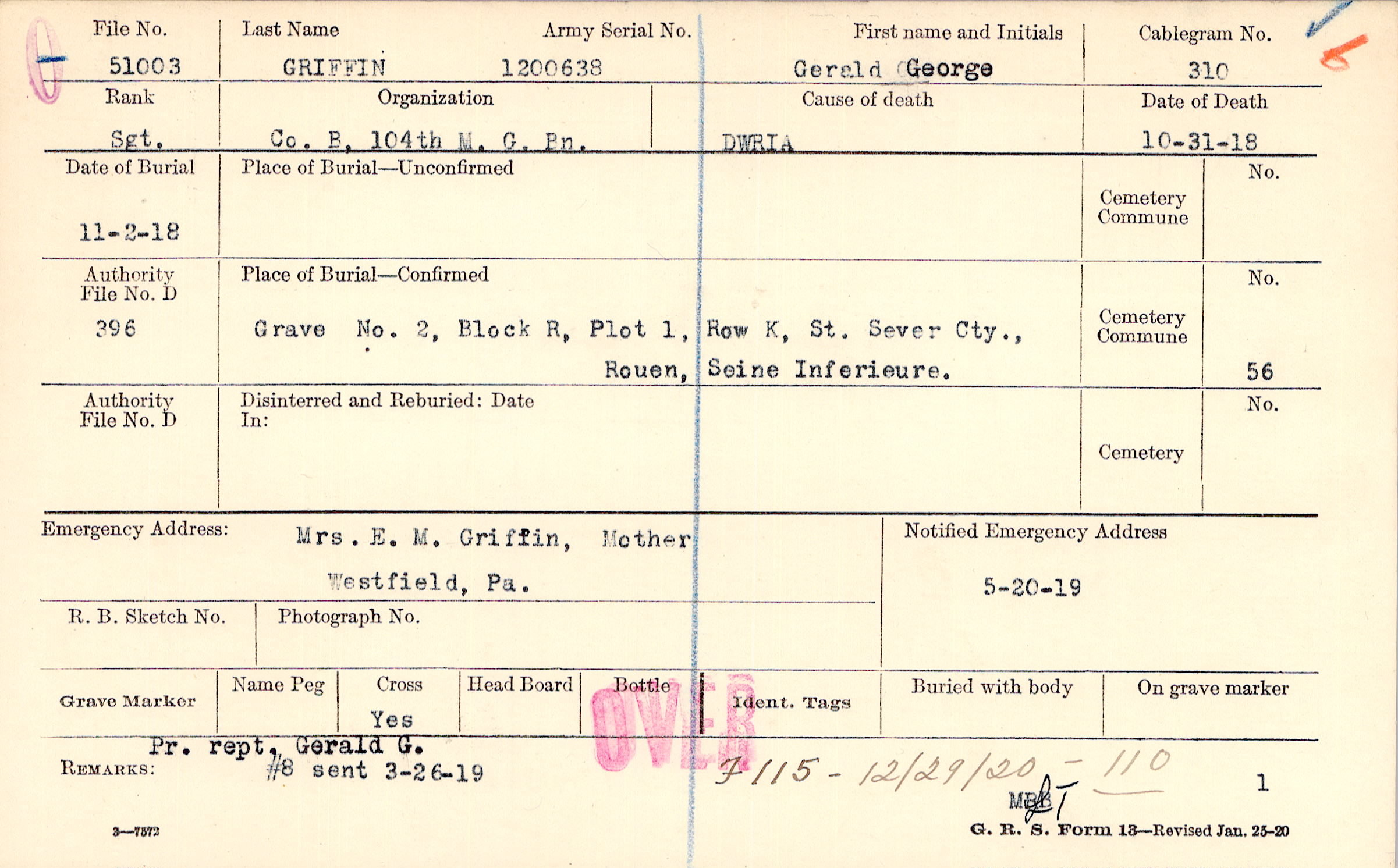 Grave 2, Block R, Plot 1, Row K, St. Sever Cty., Rouen, Seine Inferieure