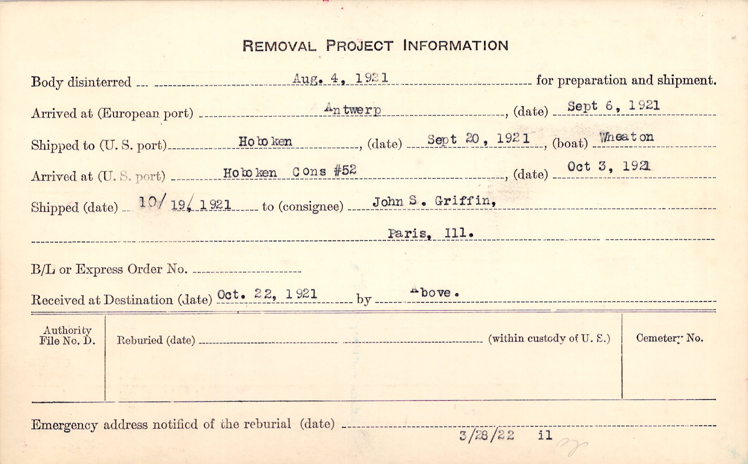Body disinterred 8/4/1921 for preparation and shipment.
