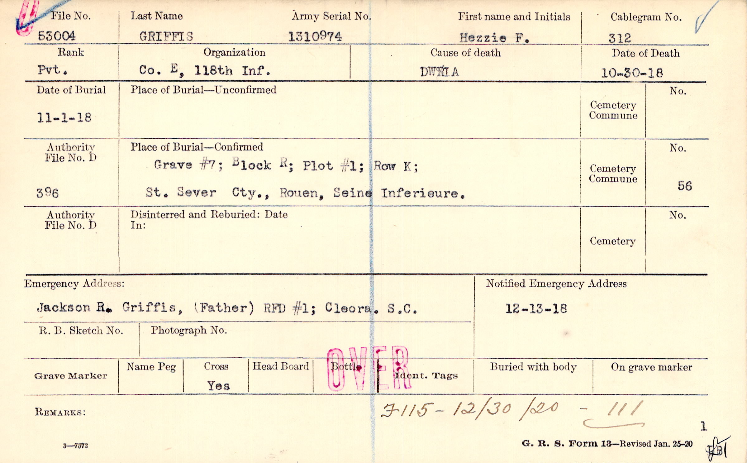 Grave #7, Block R, Plot #1, Row K, St. Sever Cty., Rouen, Seine Inferieure.
