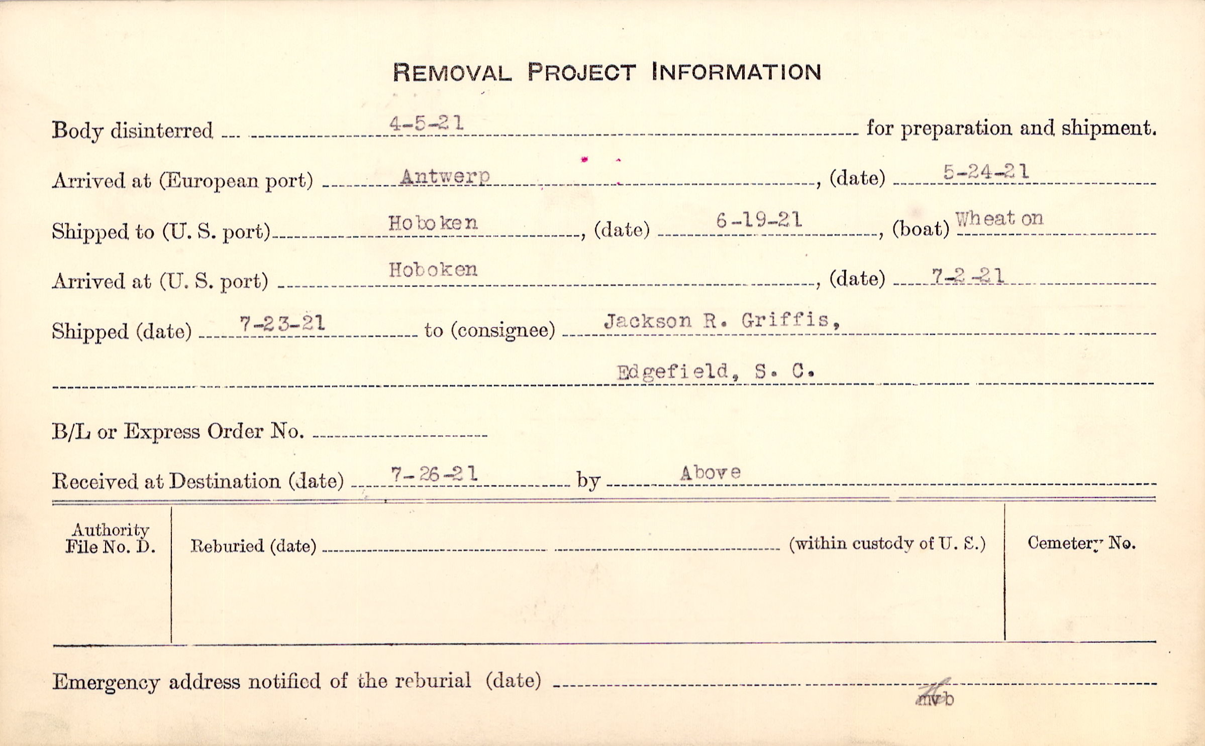 Body disinterred 4/5/1921 for preparation and shipment.