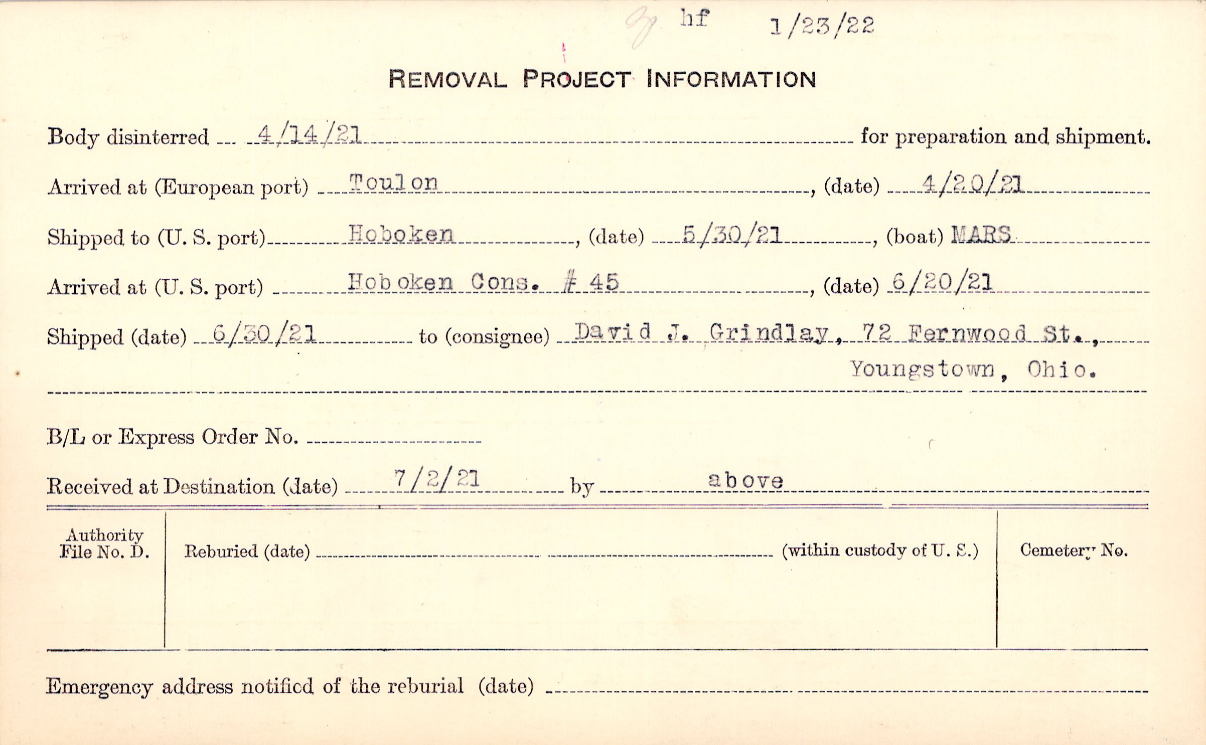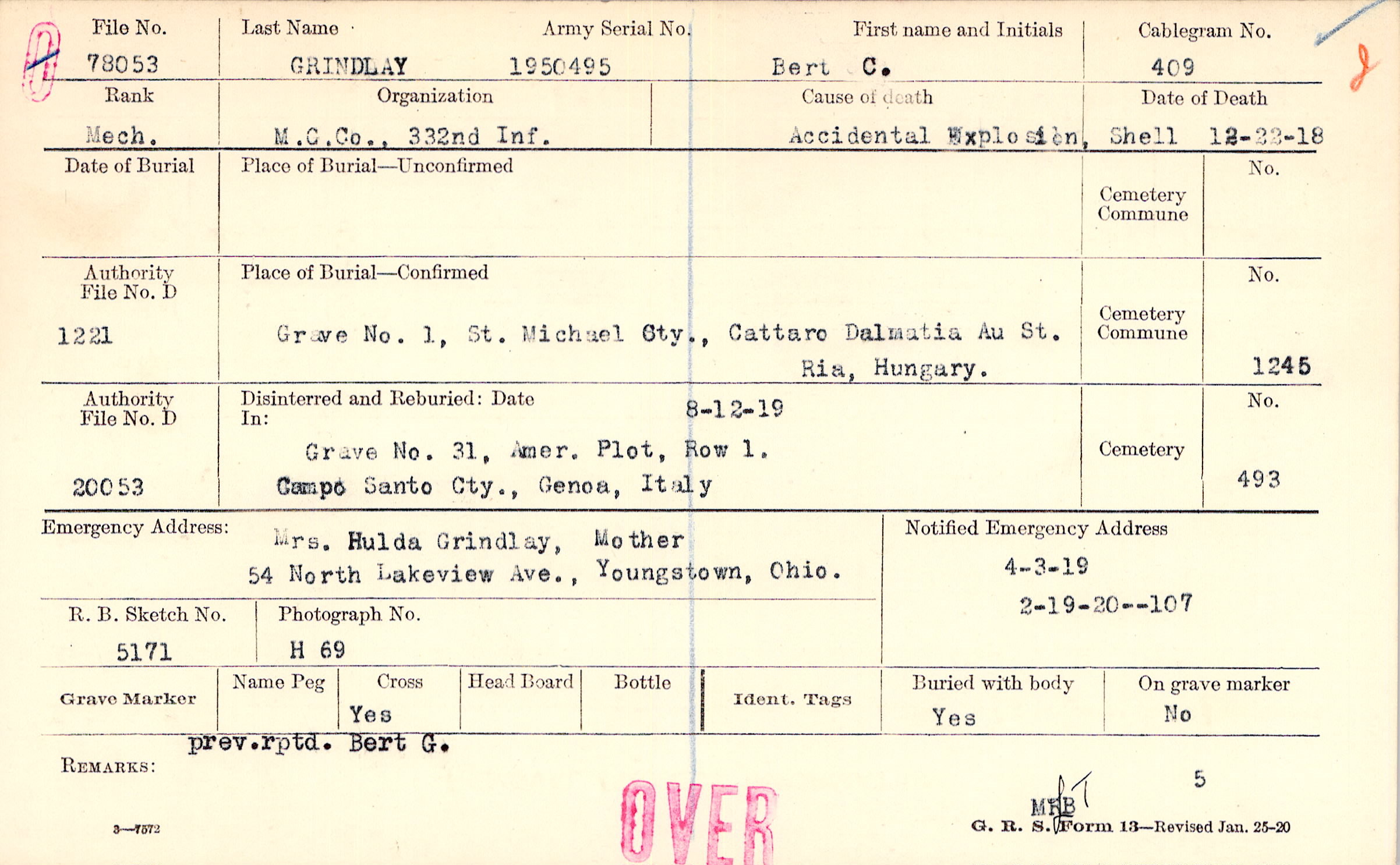 Mrs. Hulda Grindlay, Mother, 54 North Lakeview Ave., Youngstown, Ohio.