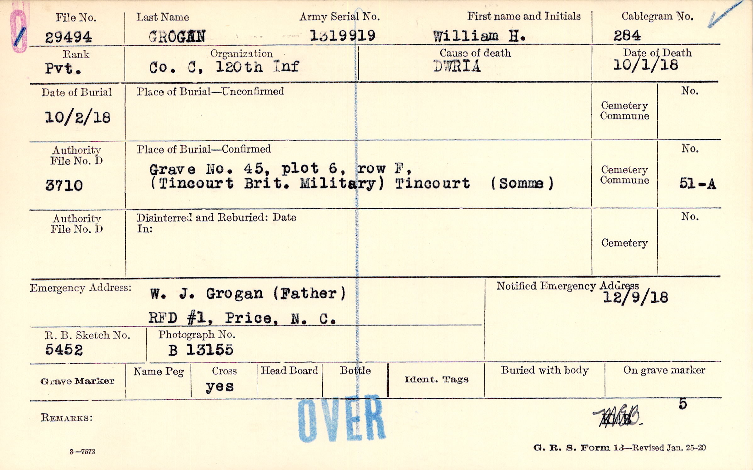 Grave 45, Plot 6, row F, Tincourt Brit. Military, Tincourt, Somme