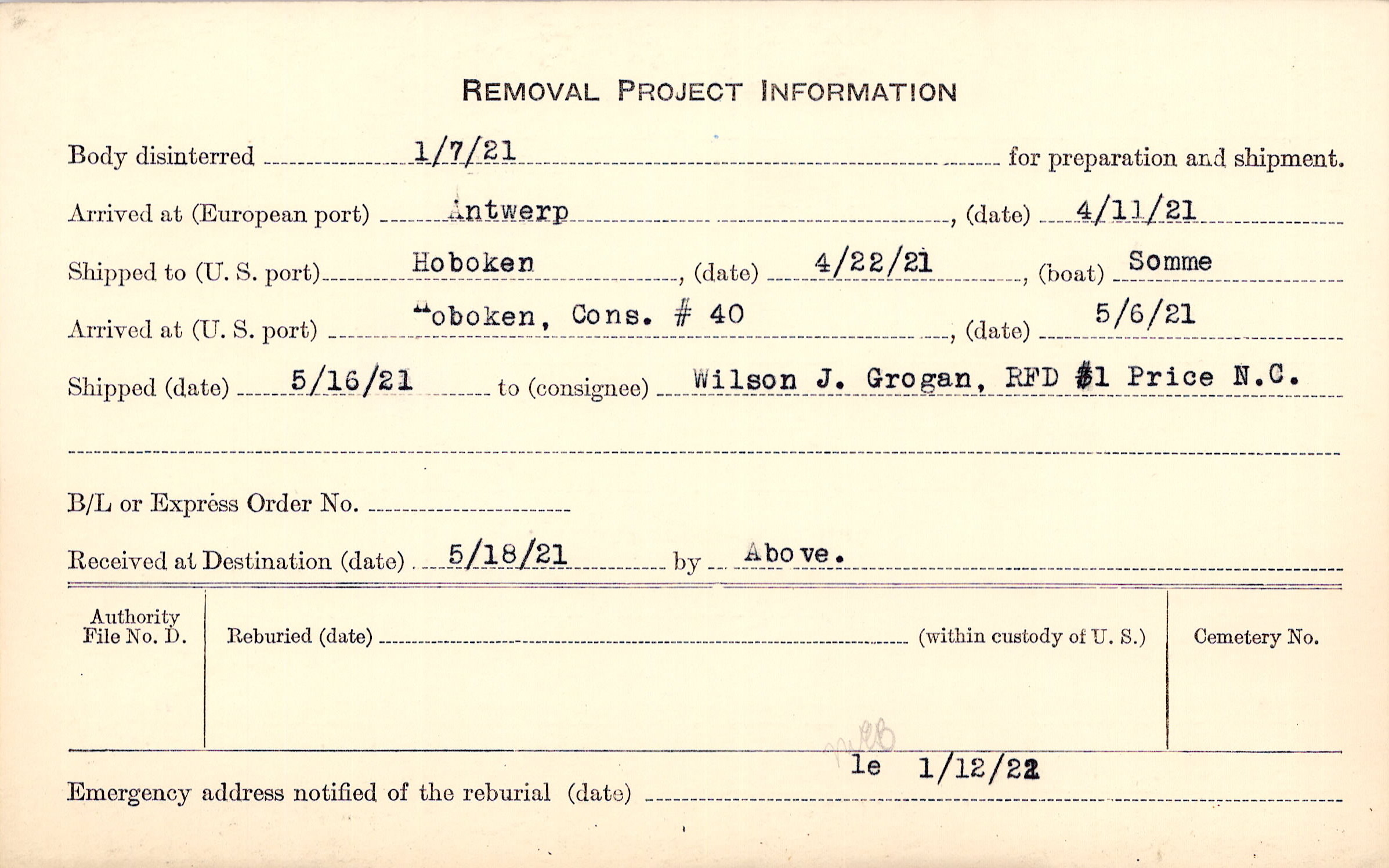 Body disinterred 1/7/1921 for preparation and shipment.