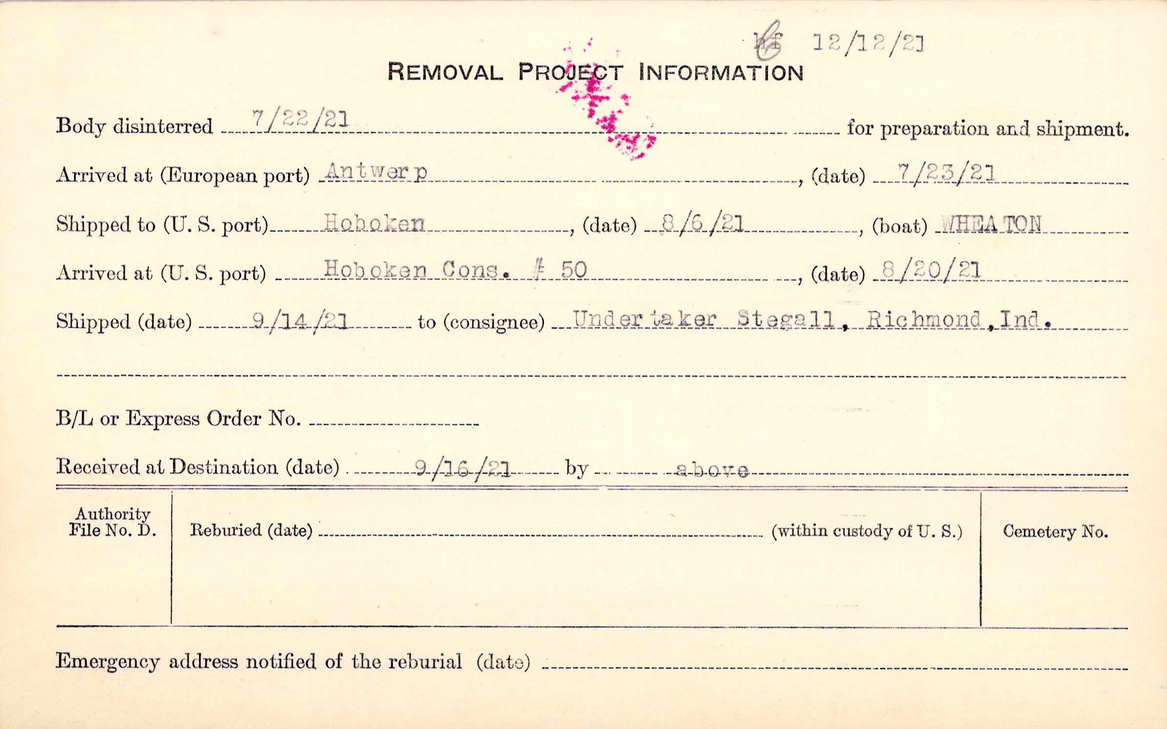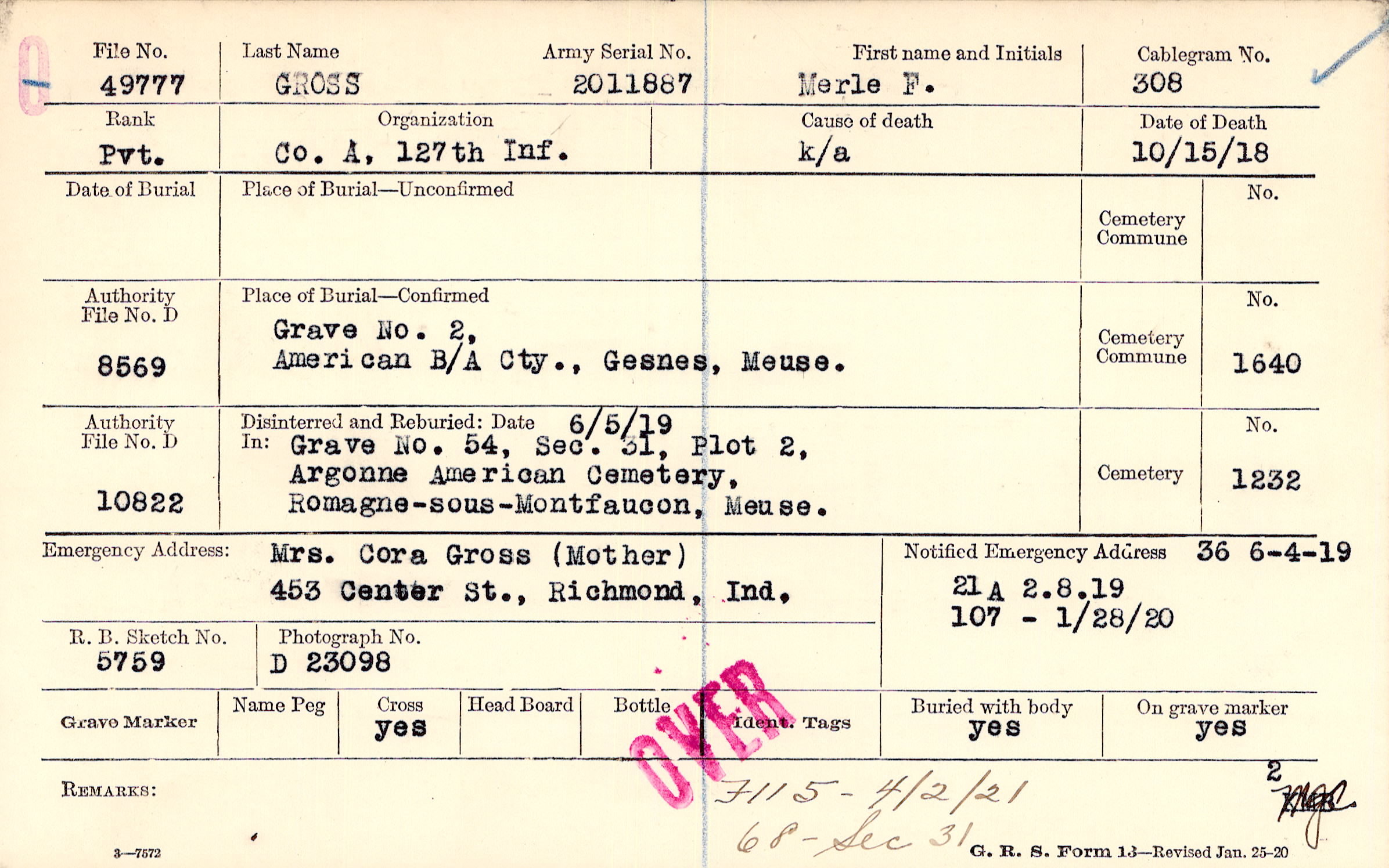 Mrs. Cora Gross (Mother), 453 Center St., Richmond, Ind.