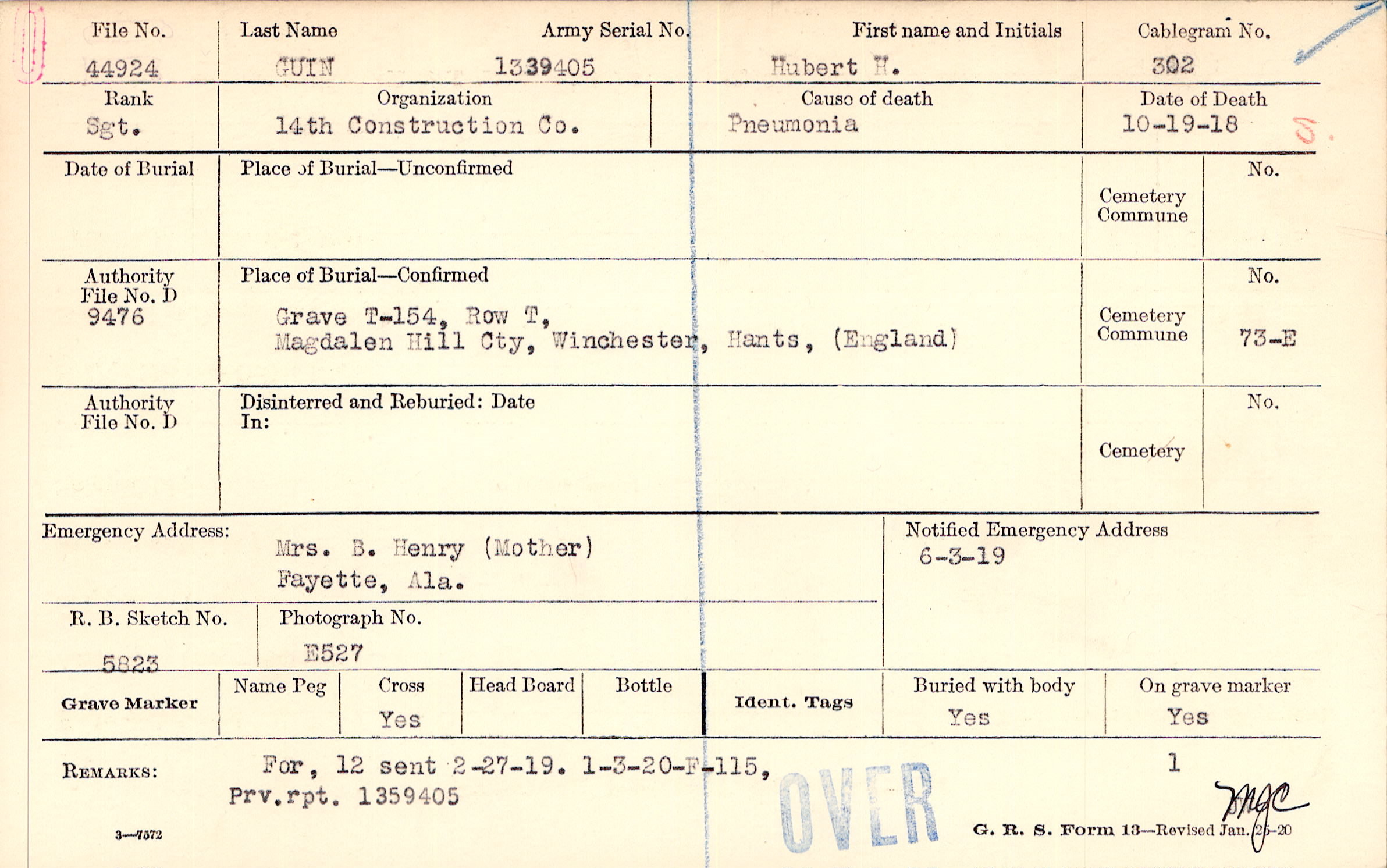 Grave T-154, Row T, Magdalen Hill Cty, Winchester, Hants, England