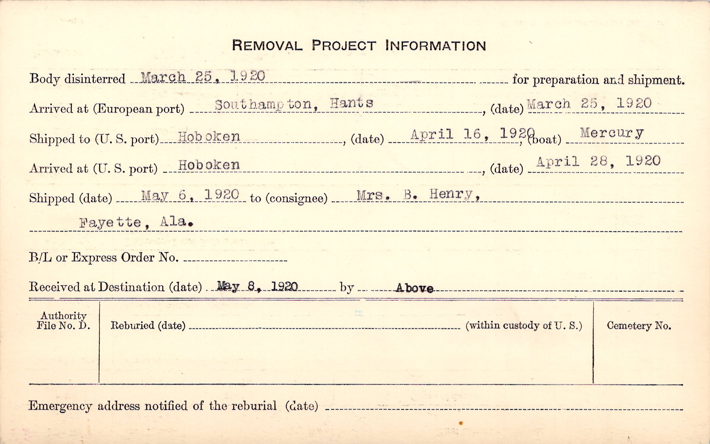 Body disinterred 3/25/1920 for preparation and shipment.