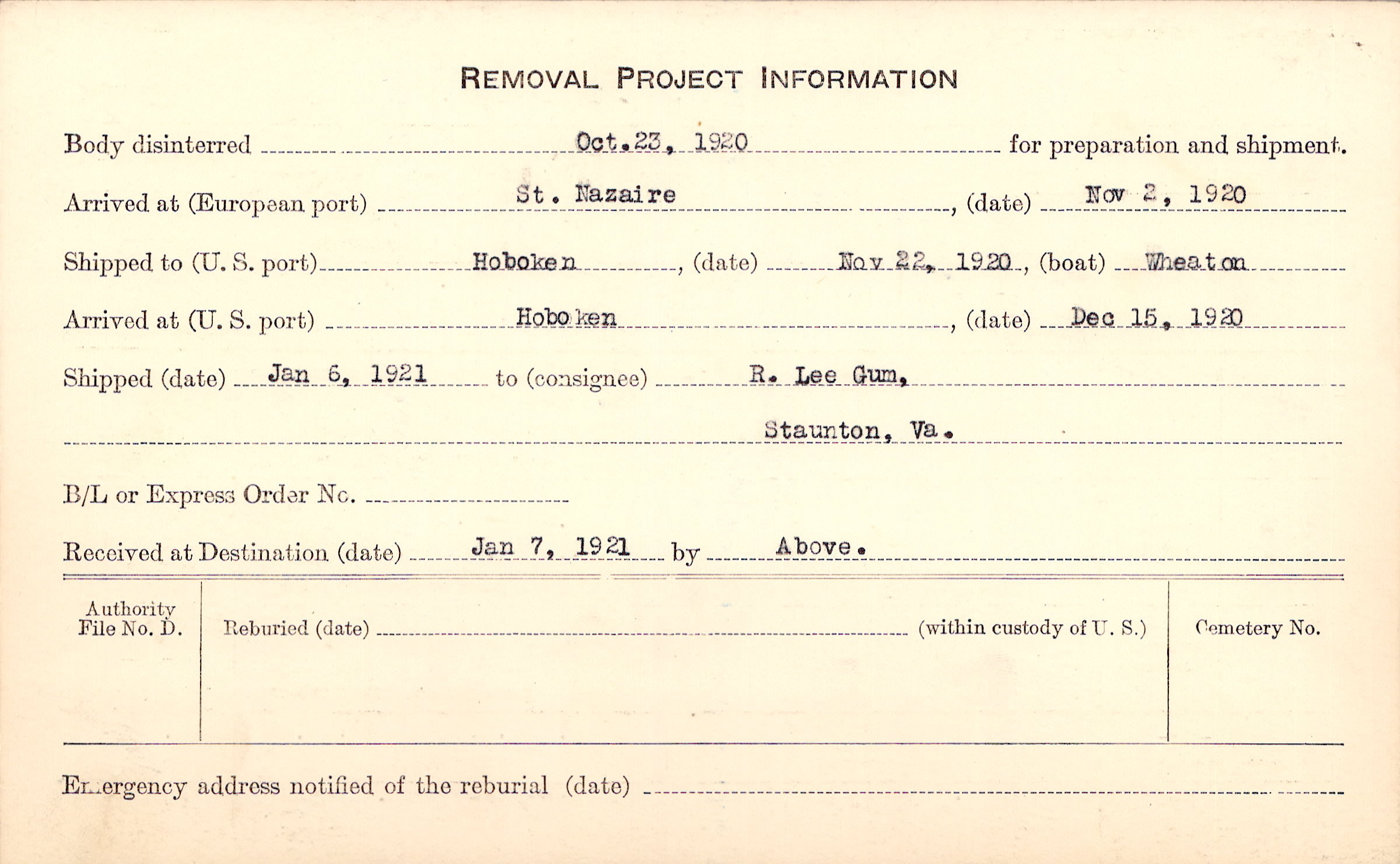 Body disinterred 10/23/1920 for preparation and shipment.