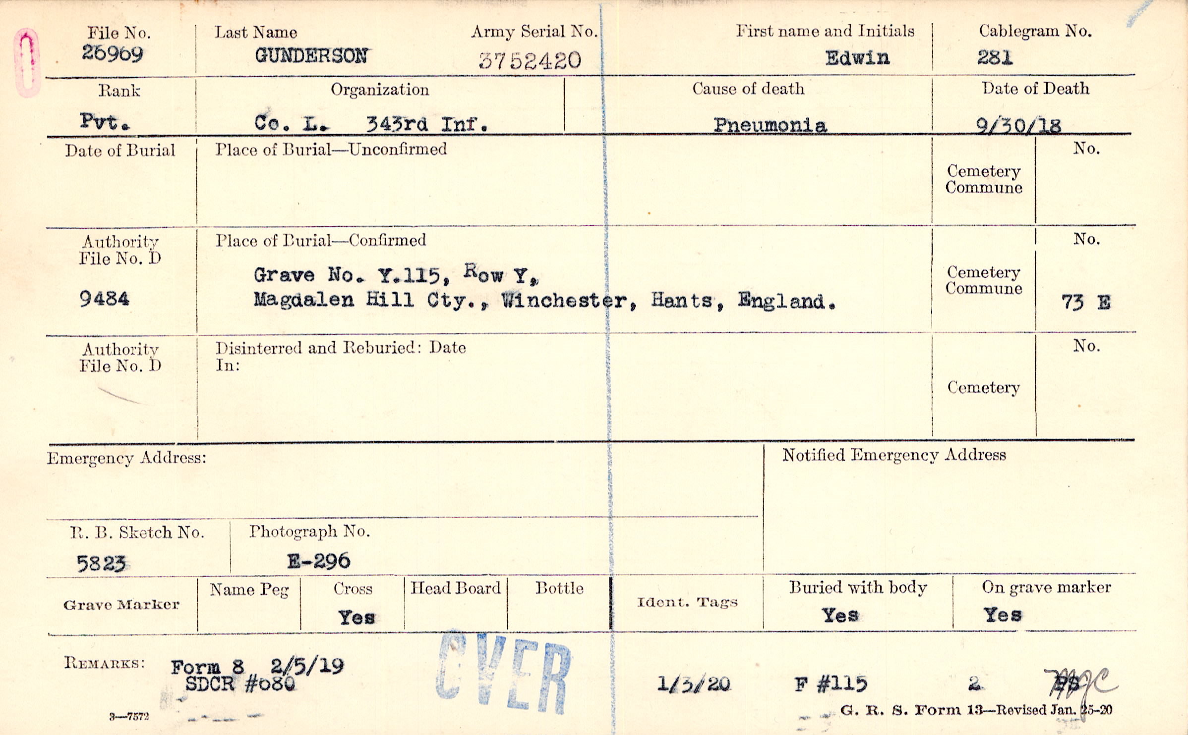 Grave Y.115, Row Y, Magdalen Hill Cty., Winchester, Hants, England.