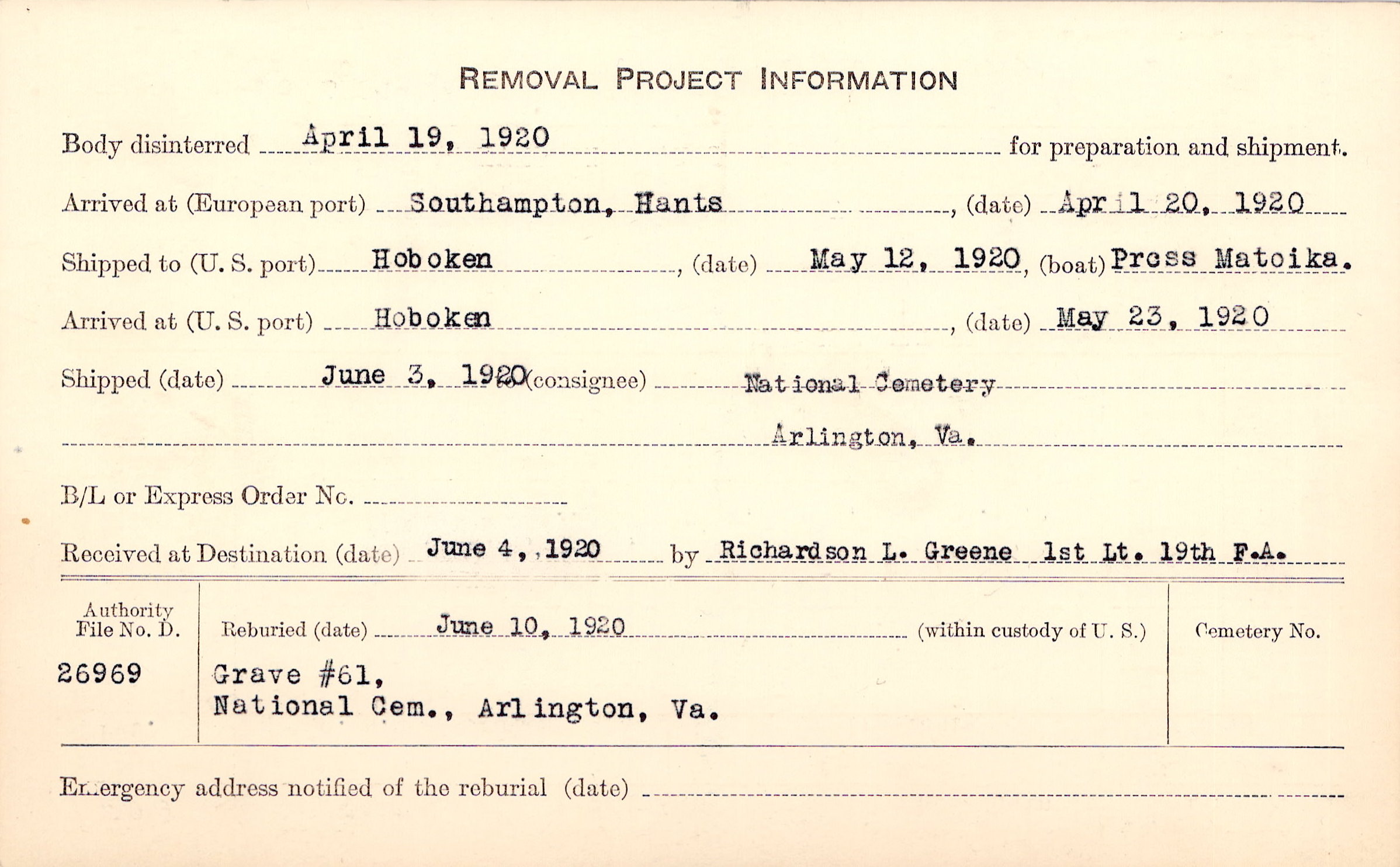 Body disinterred 4/19/1920 for preparation and shipment.