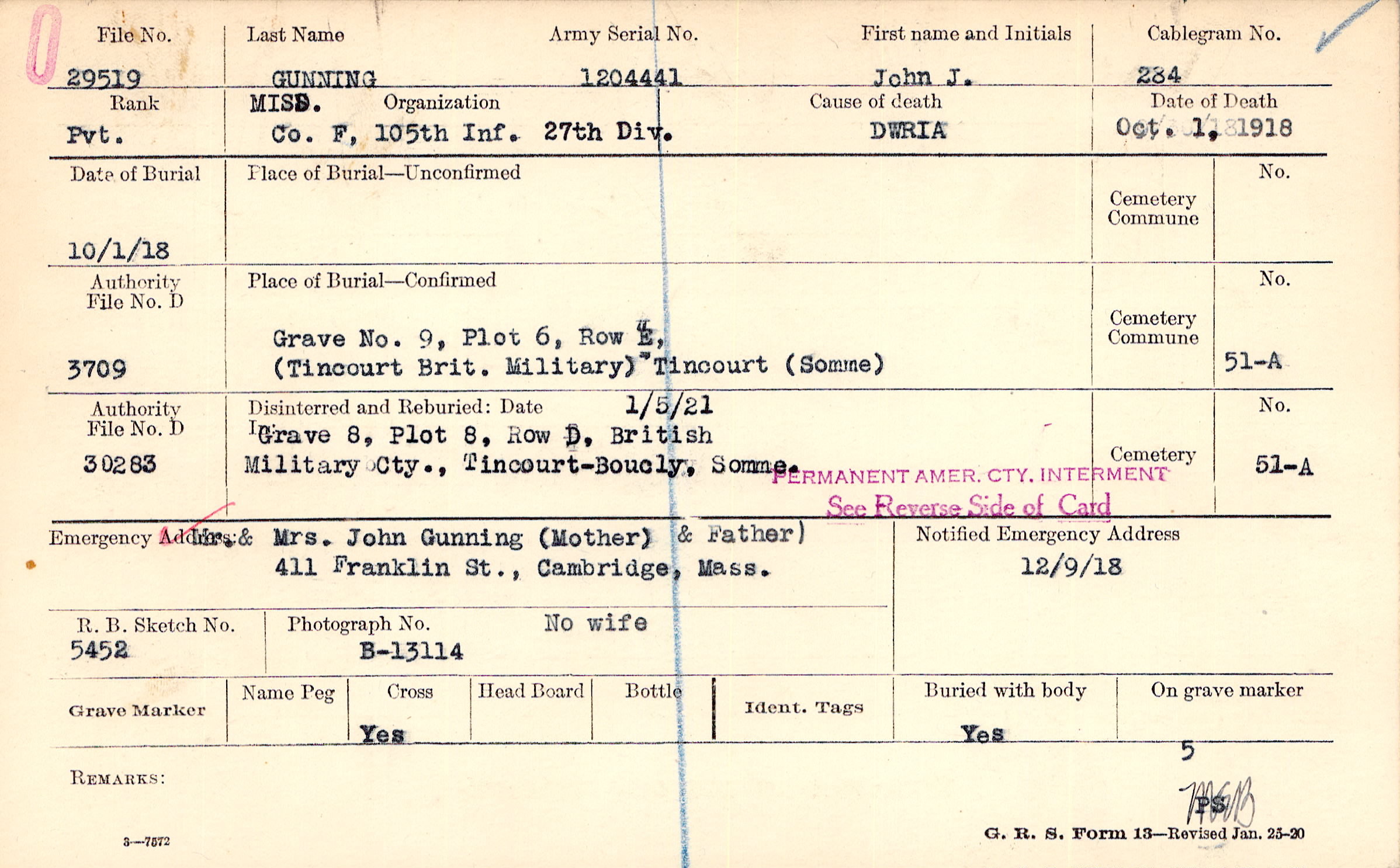 Mr. and Mrs. John Gunning (Mother) & Father), 411 Franklin St., Cambridge, Mass., No wife Mr.John Gunning, Father