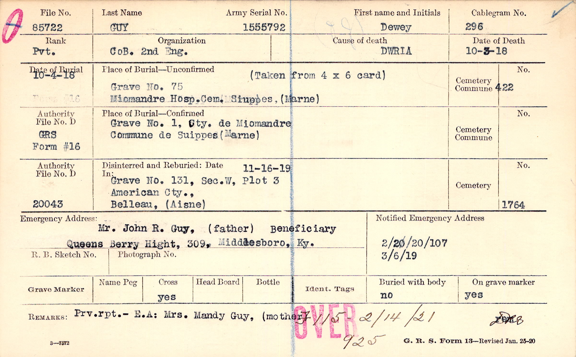Mr. John R. Guy, (father), Queens Berry Hight, 309, Middlesboro, Ky., Beneficiary
