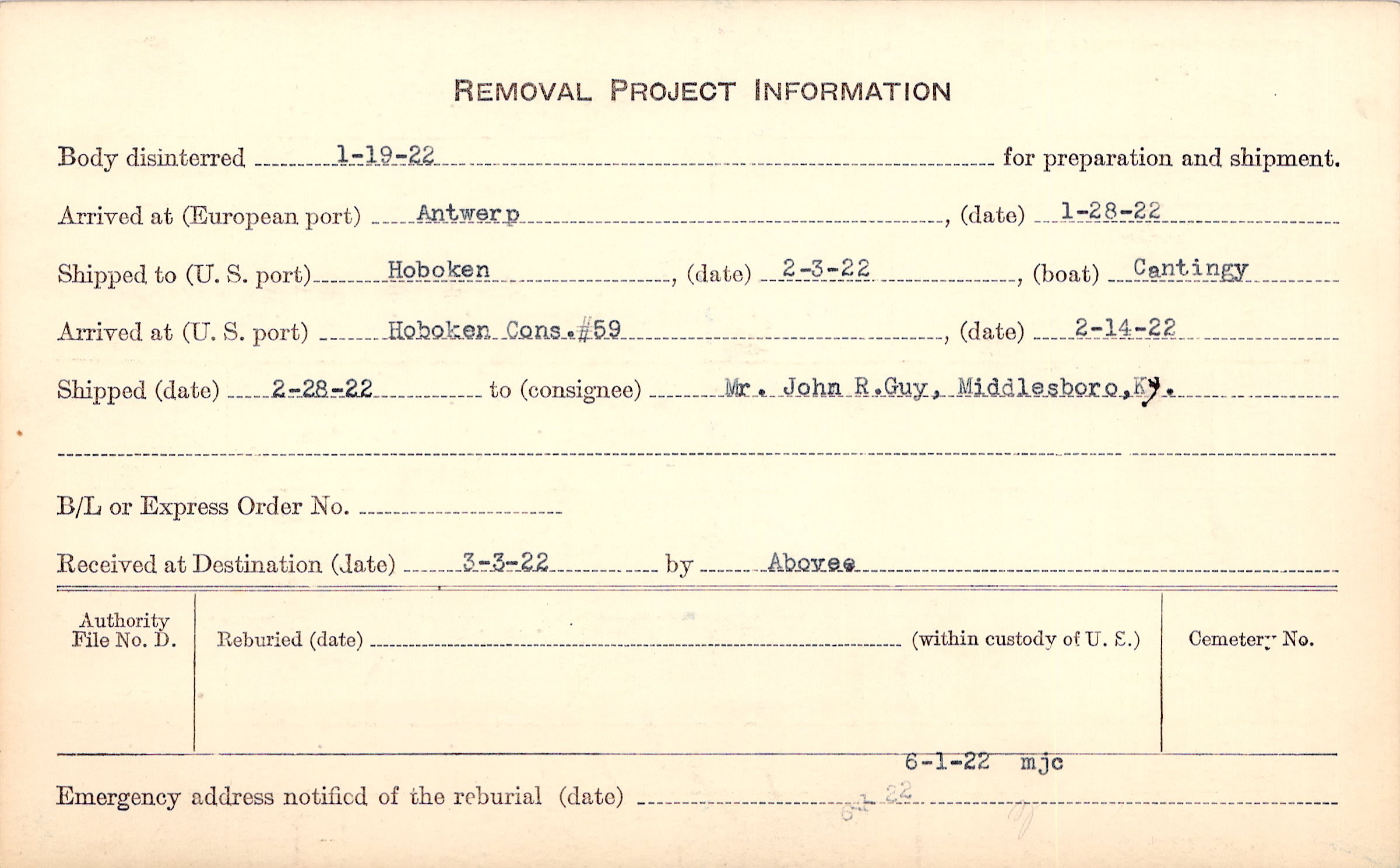Body disinterred 1/19/1922 for preparation and shipment.
