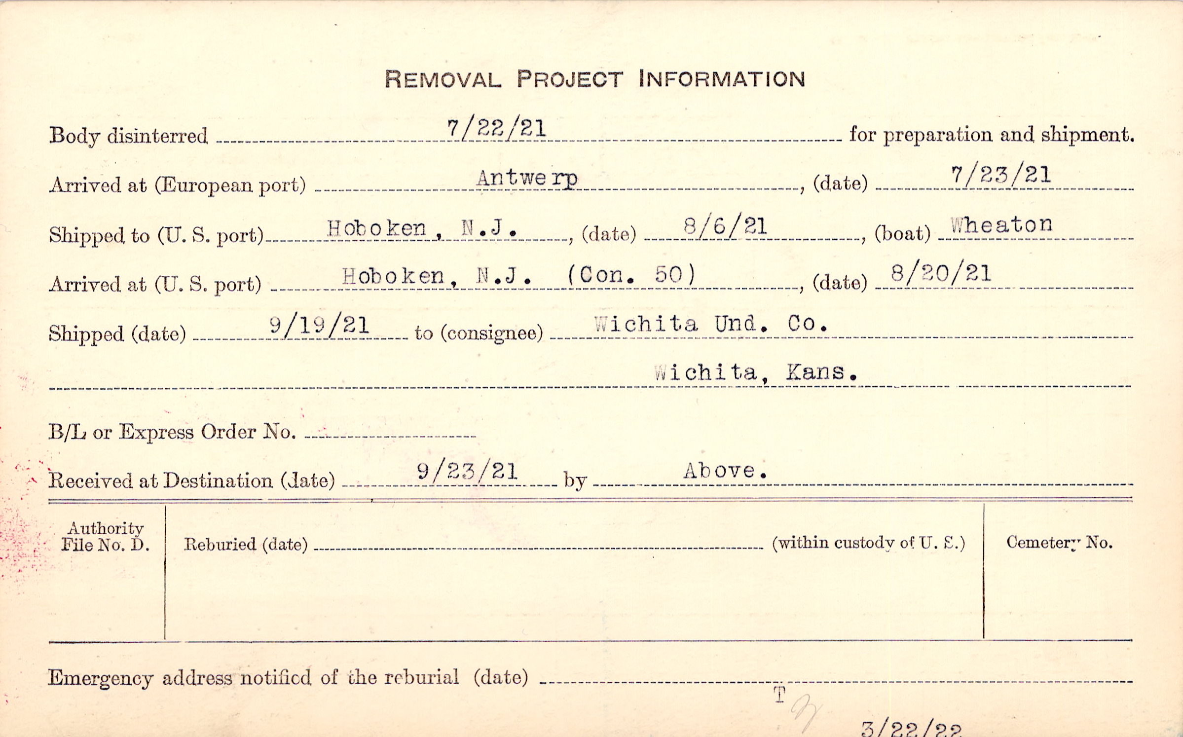 Body disinterred 7/22/1921 for preparation and shipment.