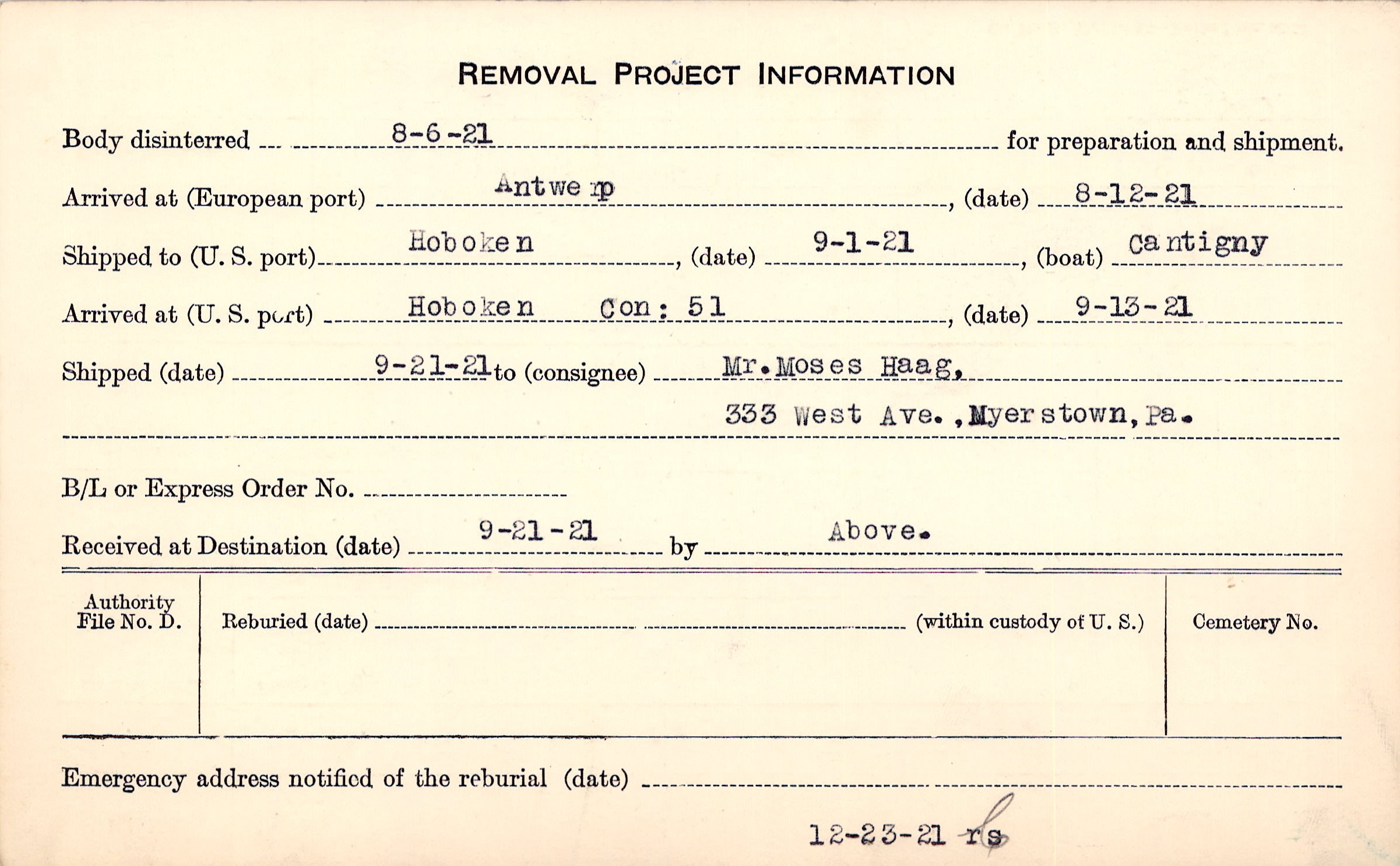 Body disinterred 8/6/1921 for preparation and shipment.