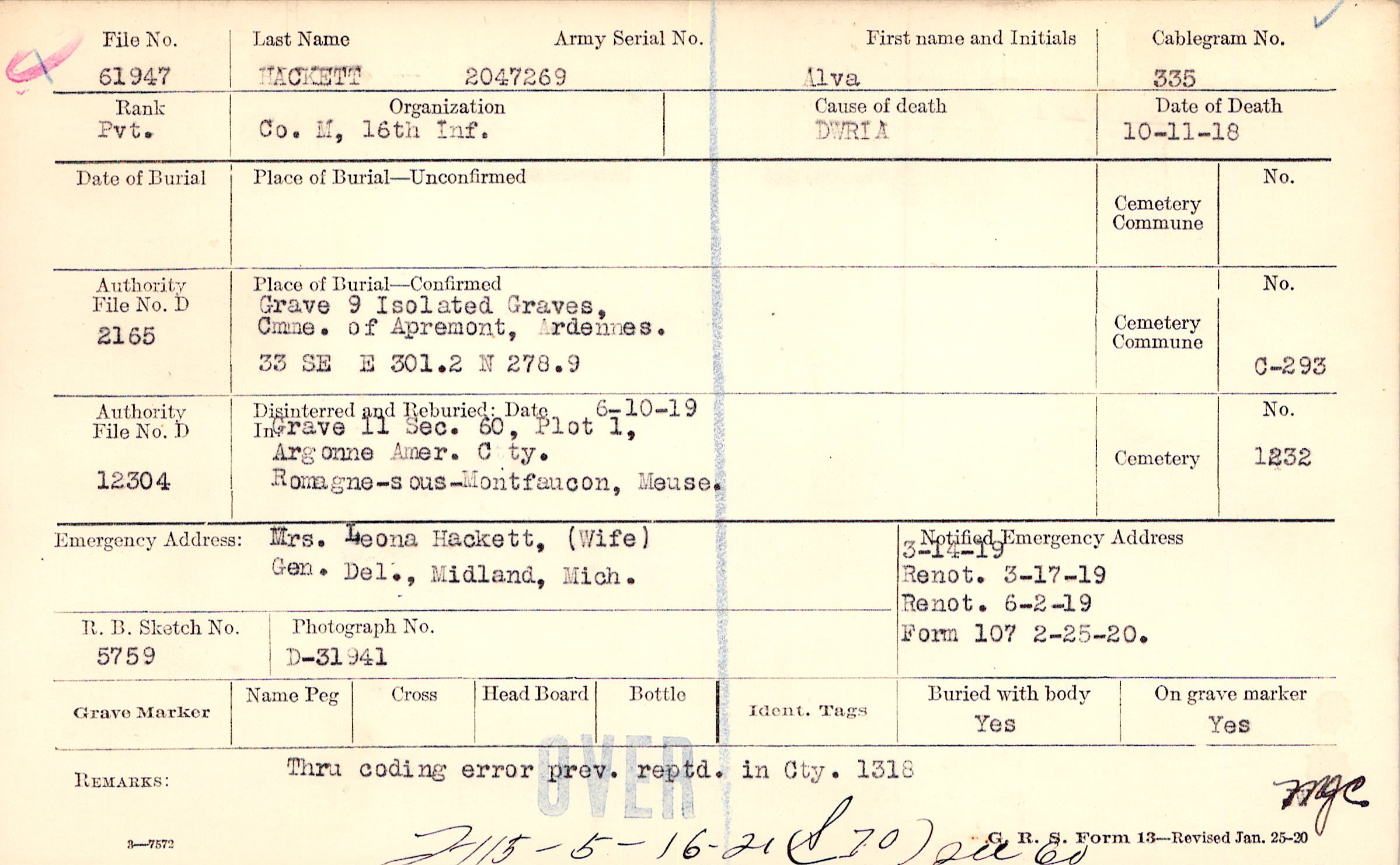 Mrs. Leona Hackett, (Wife), Gen. Del., Midland, Mich.