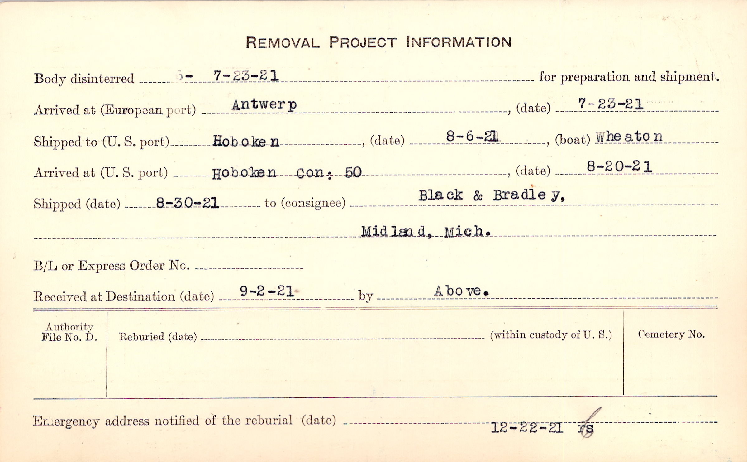 Body disinterred 7/23/1921 for preparation and shipment.