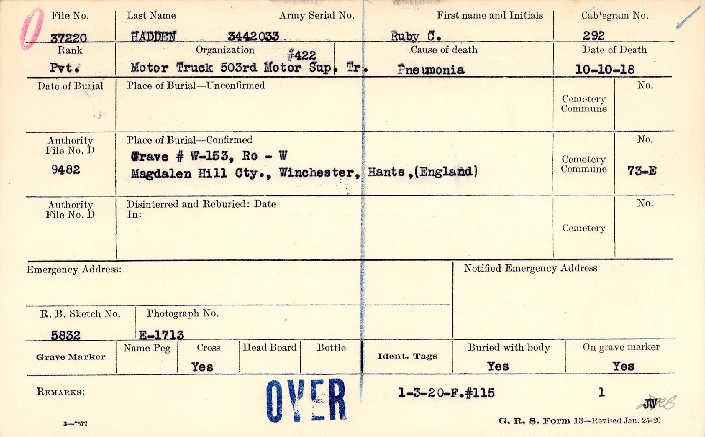 Grave # W-153, Ro - W, Magdalen Hill Cty., Winchester, Hants, England