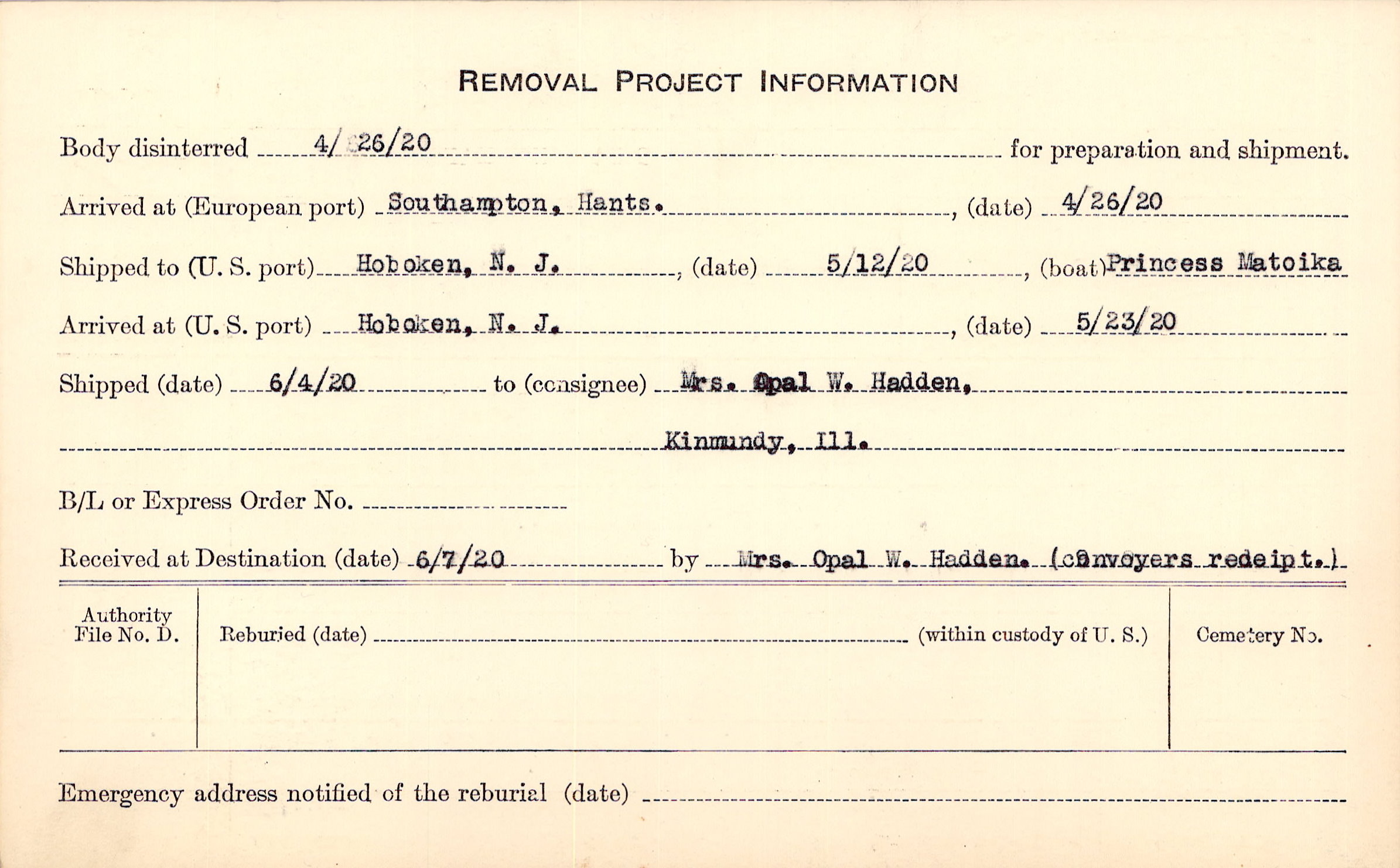 Body disinterred 4/26/1920 for preparation and shipment.