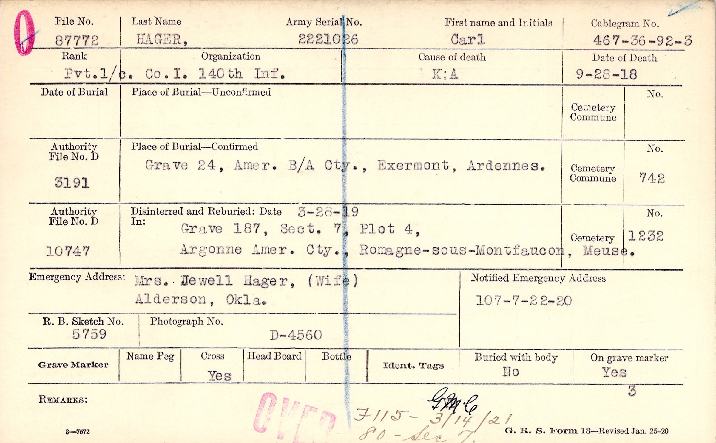 Grave 187, Section 7, Plot 4, Argonne American Cemetery, Romagne-sous-Montfaucon, Meuse