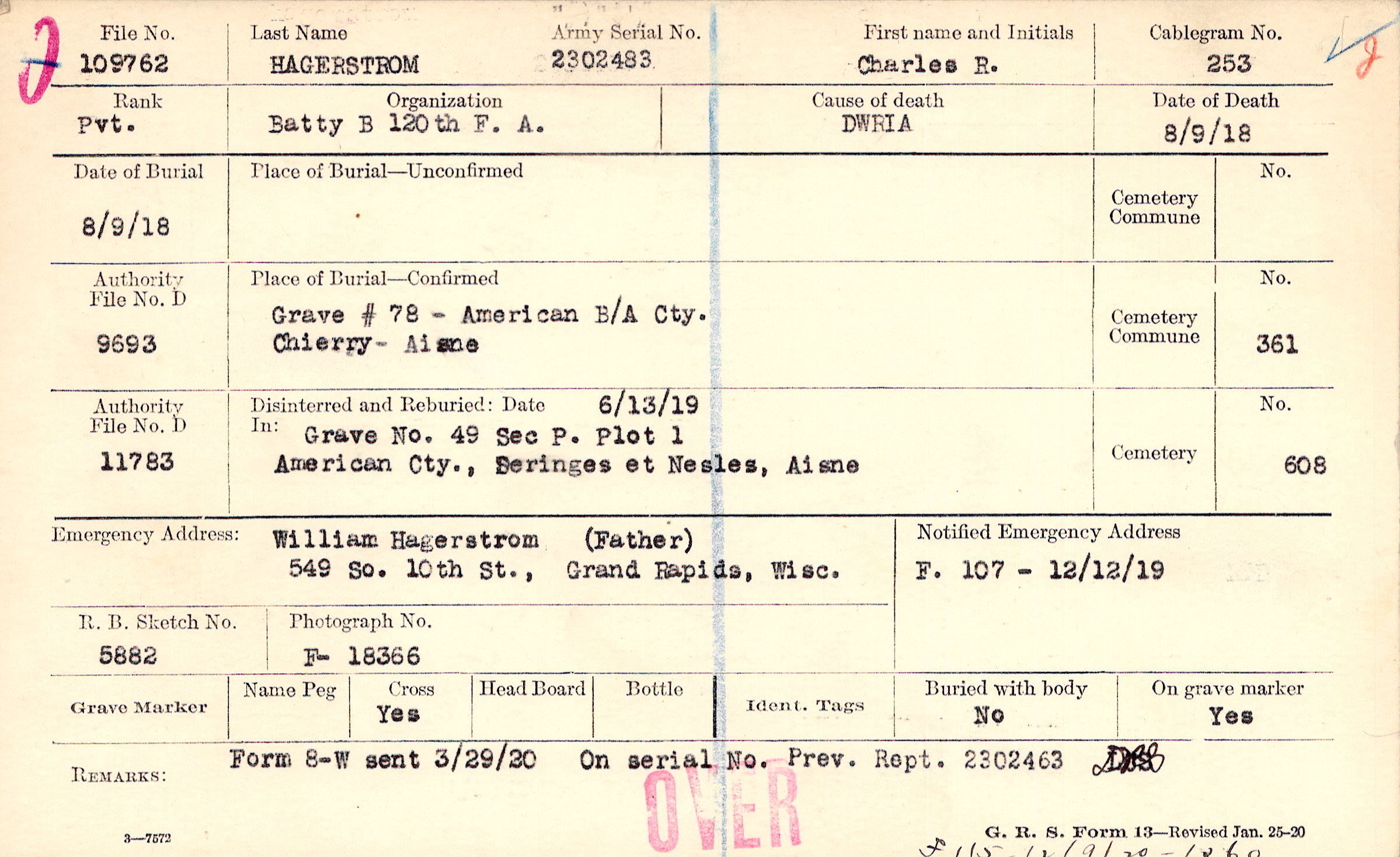 William Hagerstrom (Father), 549 So. 10th St., Grand Rapids, Wisc.