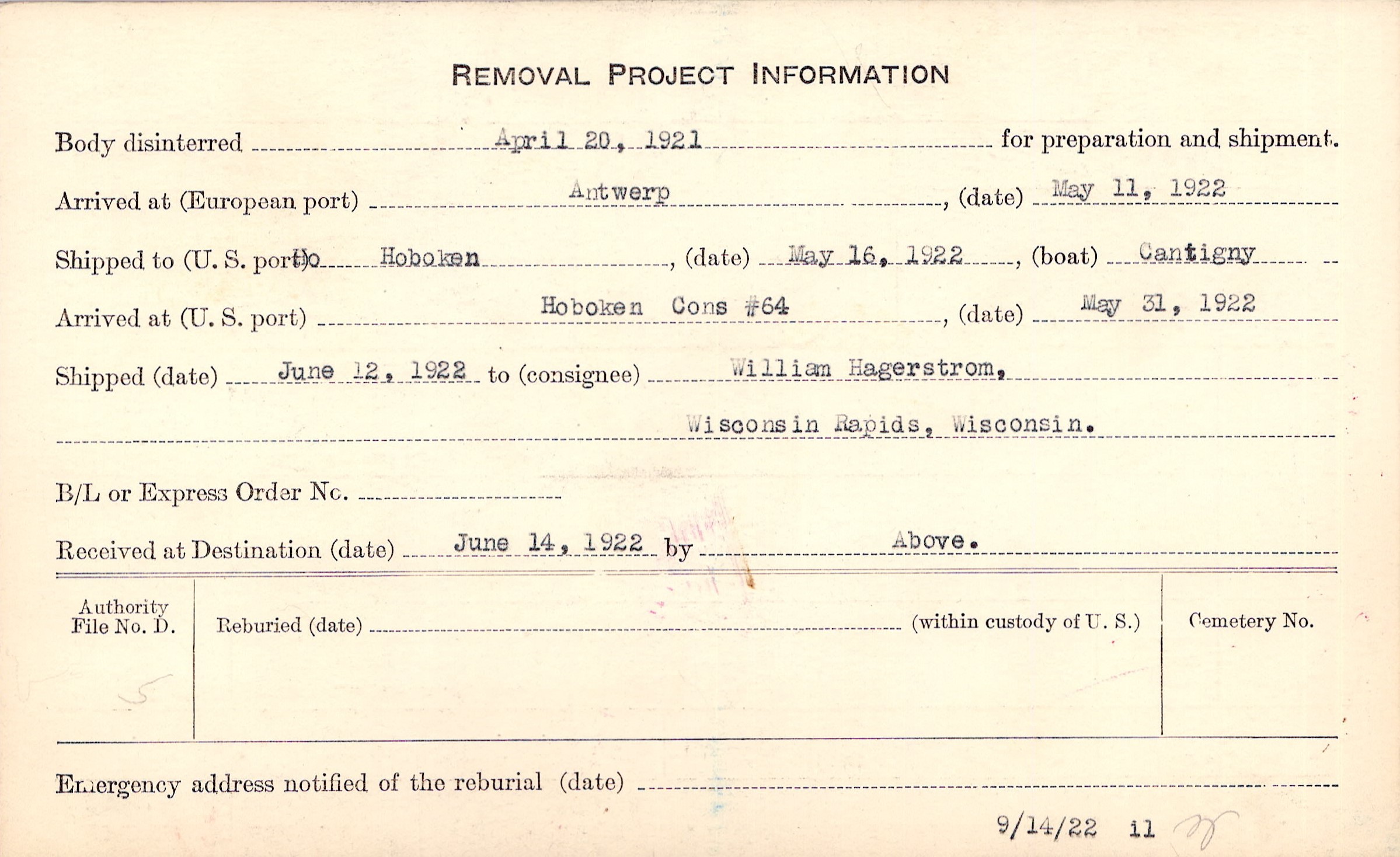 Body disinterred 4/20/1921 for preparation and shipment.