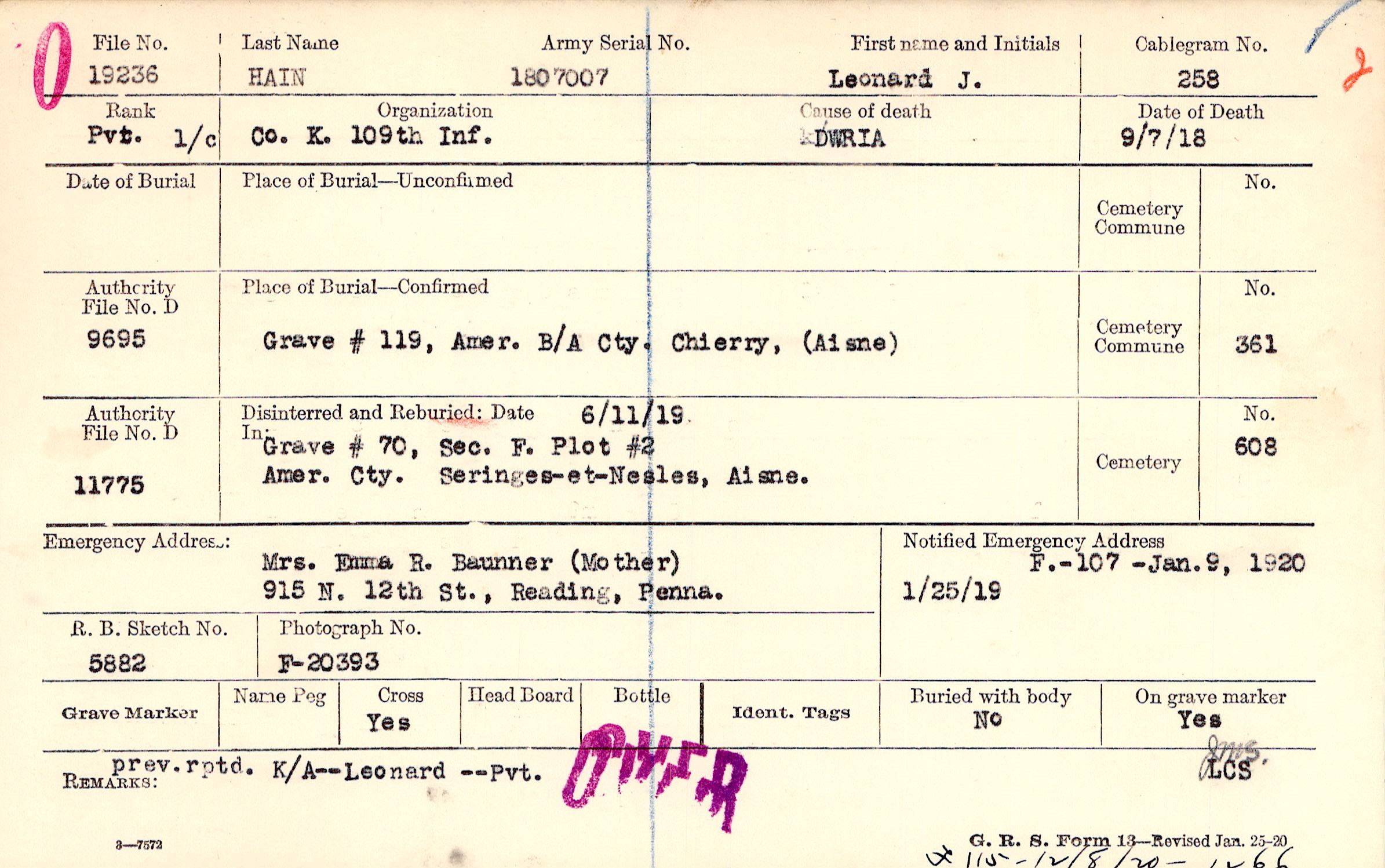 prev. rptd. K/A--Leonard --Pvt., F 115 - 12/8/20 - 1266