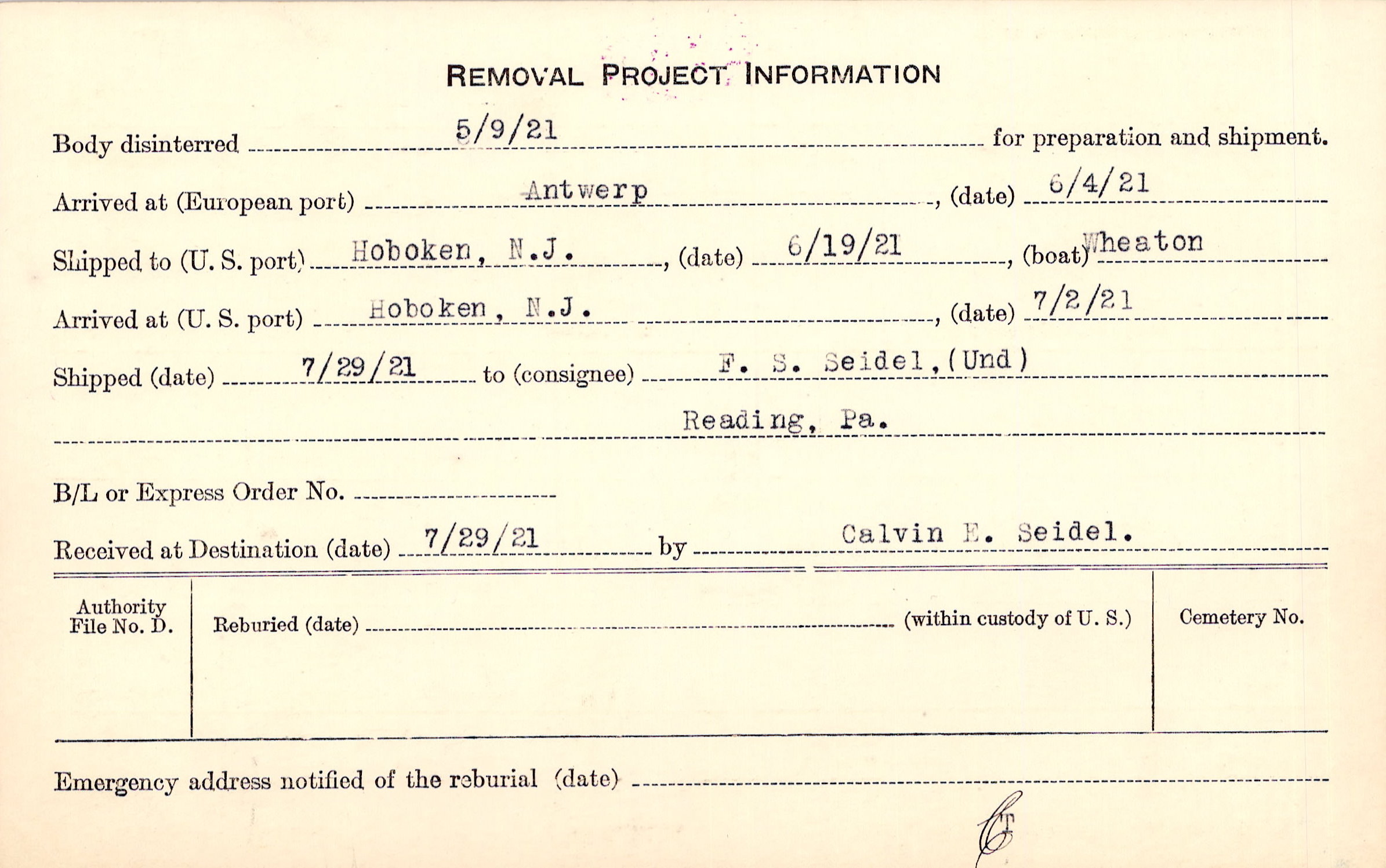 Body disinterred 5/9/1921 for preparation and shipment.