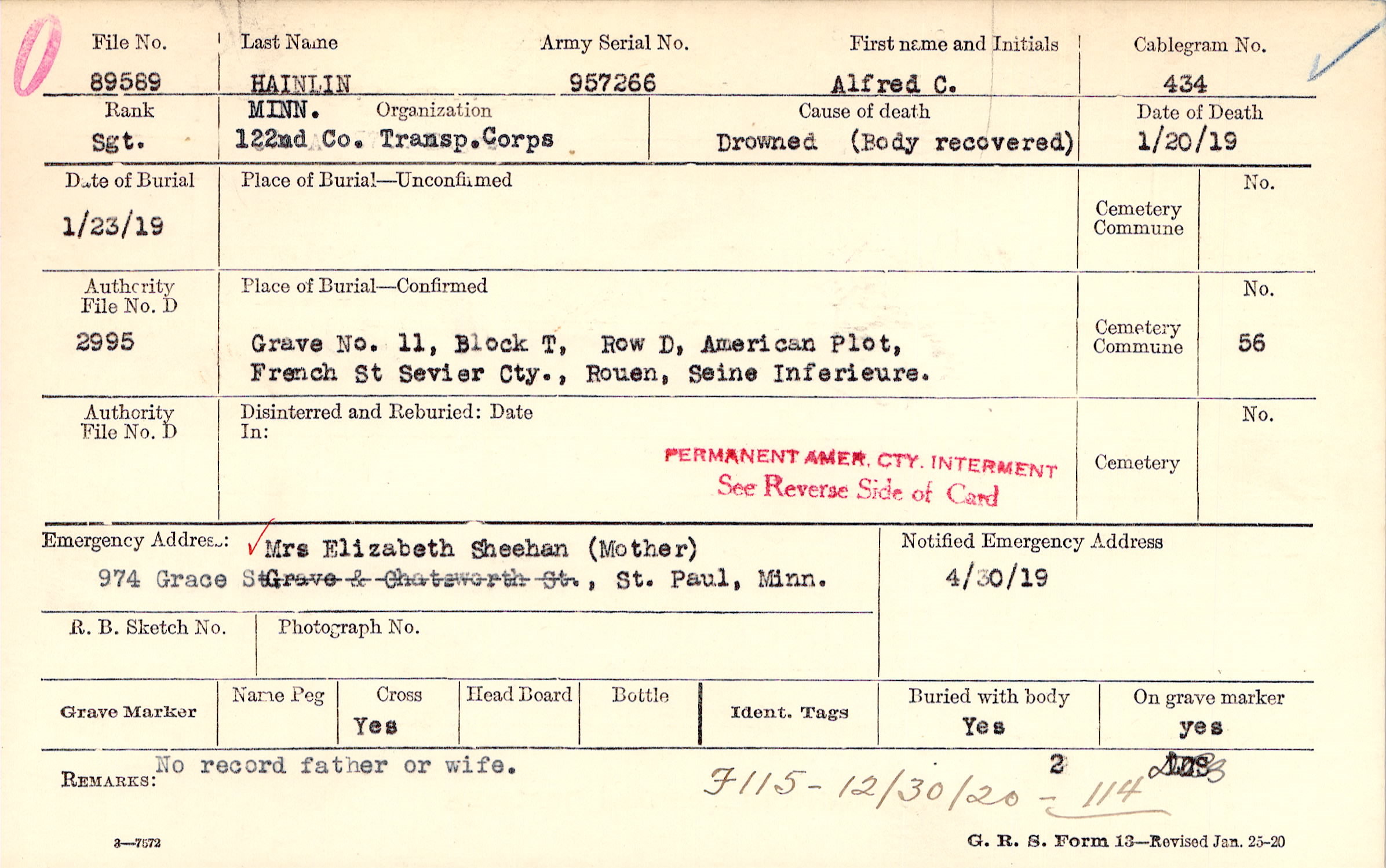 Grave 11, Block T, Row D, American Plot, French St Sevier Cty., Rouen, Seine Inferieure.